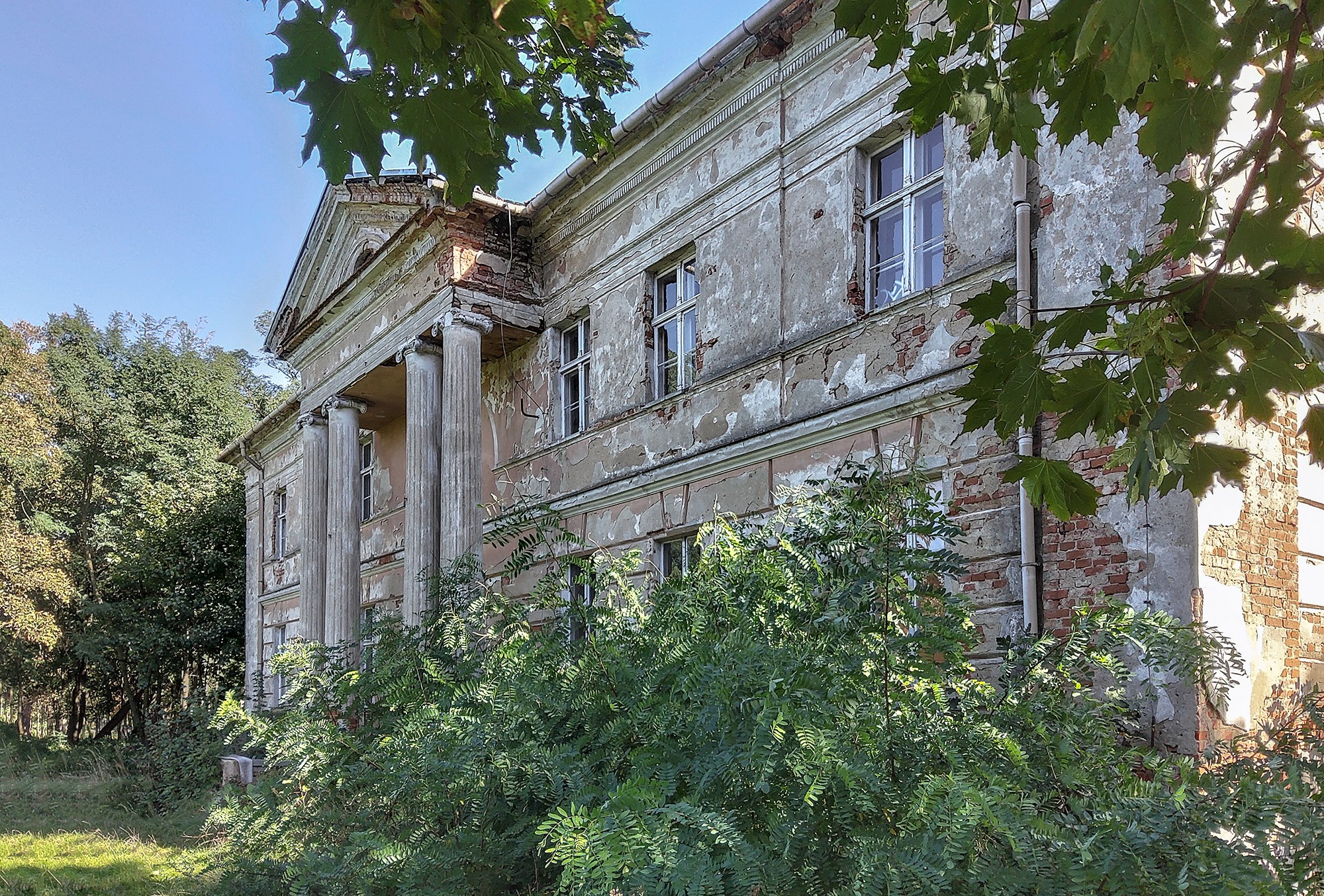In der Woiwodschaft Großpolen, etwa 30 Kilometer südwestlich von Posen, liegt das renovierungsbedürftige Gutshaus in Granówko. Das Anwesen, ein imposantes Herrenhaus aus dem Jahr 1830, besticht durch seine klassische Architektur mit einem rechteckigen Grundriss und einem markanten Vier-Säulen-Portikus. Auf rund 1.250 Quadratmetern Nutzfläche verteilt sich der zweigeschossige Bau, der komplett unterkellert ist und zusätzlichen Raum im ausbaubaren Dachgeschoss bietet, der für kreative Ideen genutzt werden kann.