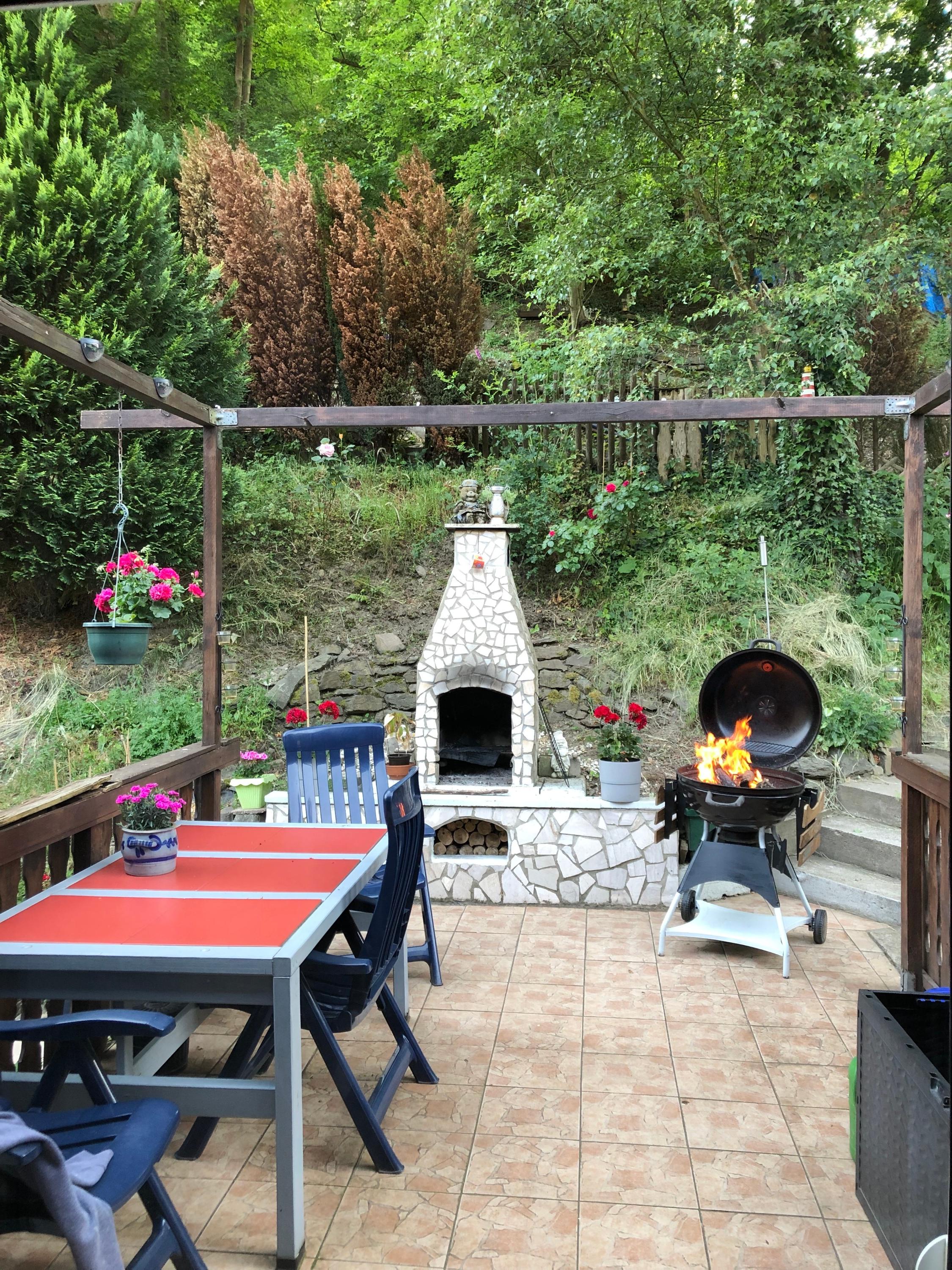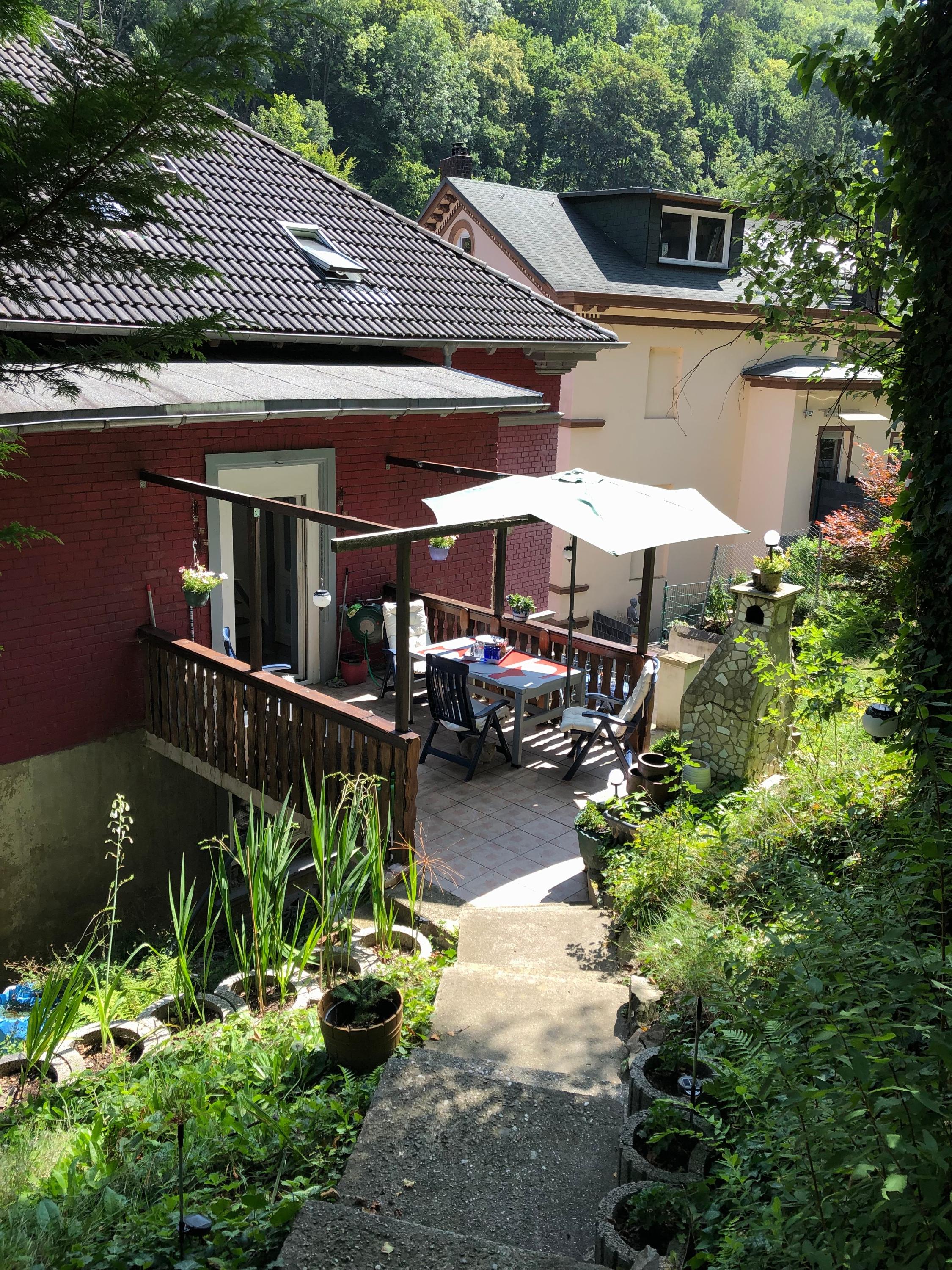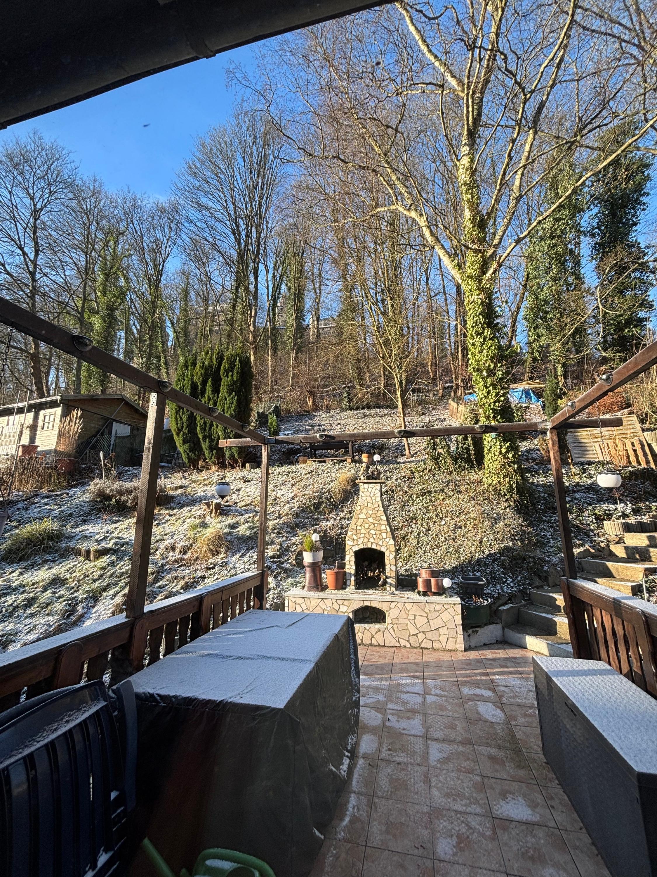 Das Haus ist voll unterkellert, beheizt und bietet eine integrierte Garage mit direktem Zugang. Der gepflegte Garten (ca. 600 m²) liegt idyllisch am Hang und ist über eine großzügige Terrasse erreichbar.