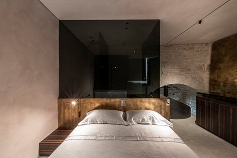 Darüber liegt ein Mezzanin von ca. 30 m², nutzbar als Schlafbereich, Arbeitsraum oder Rückzugszone. Eine geschwungene Stahltreppe verbindet beide Ebenen.