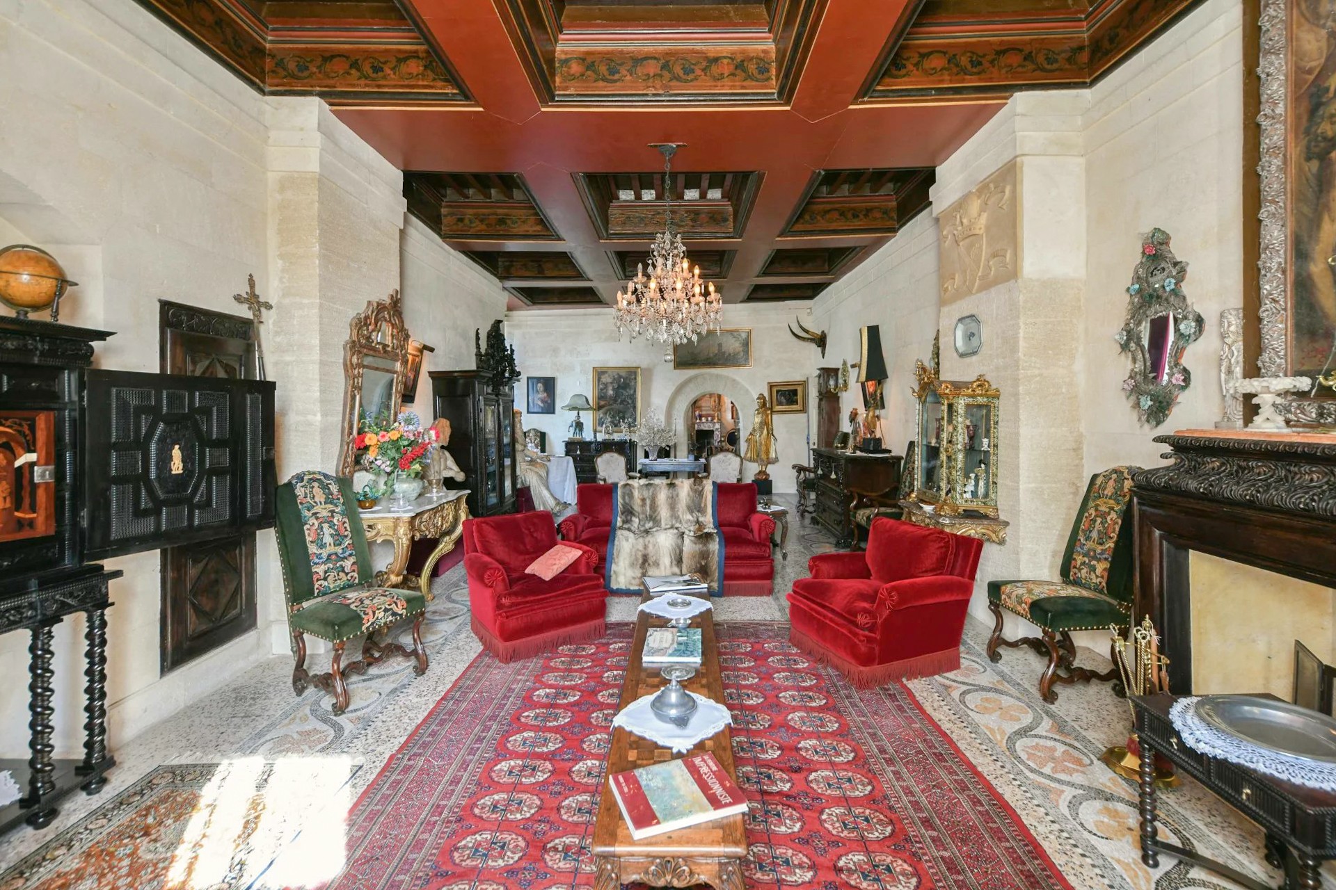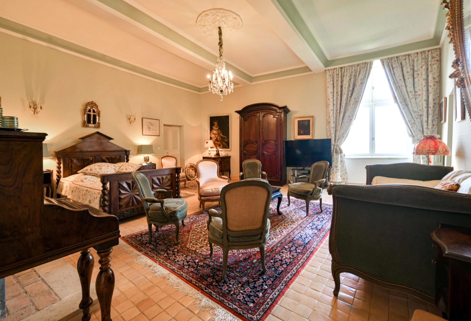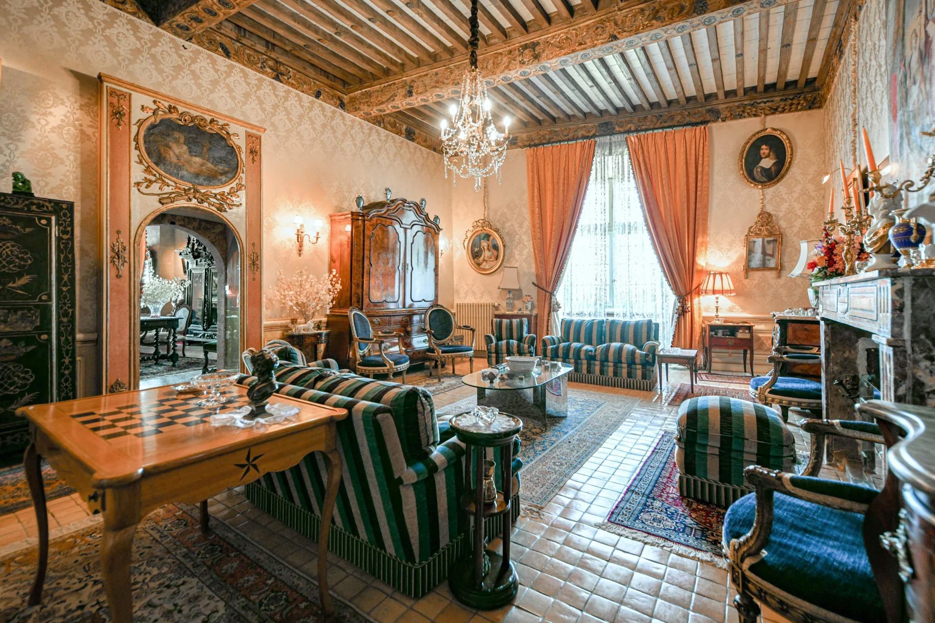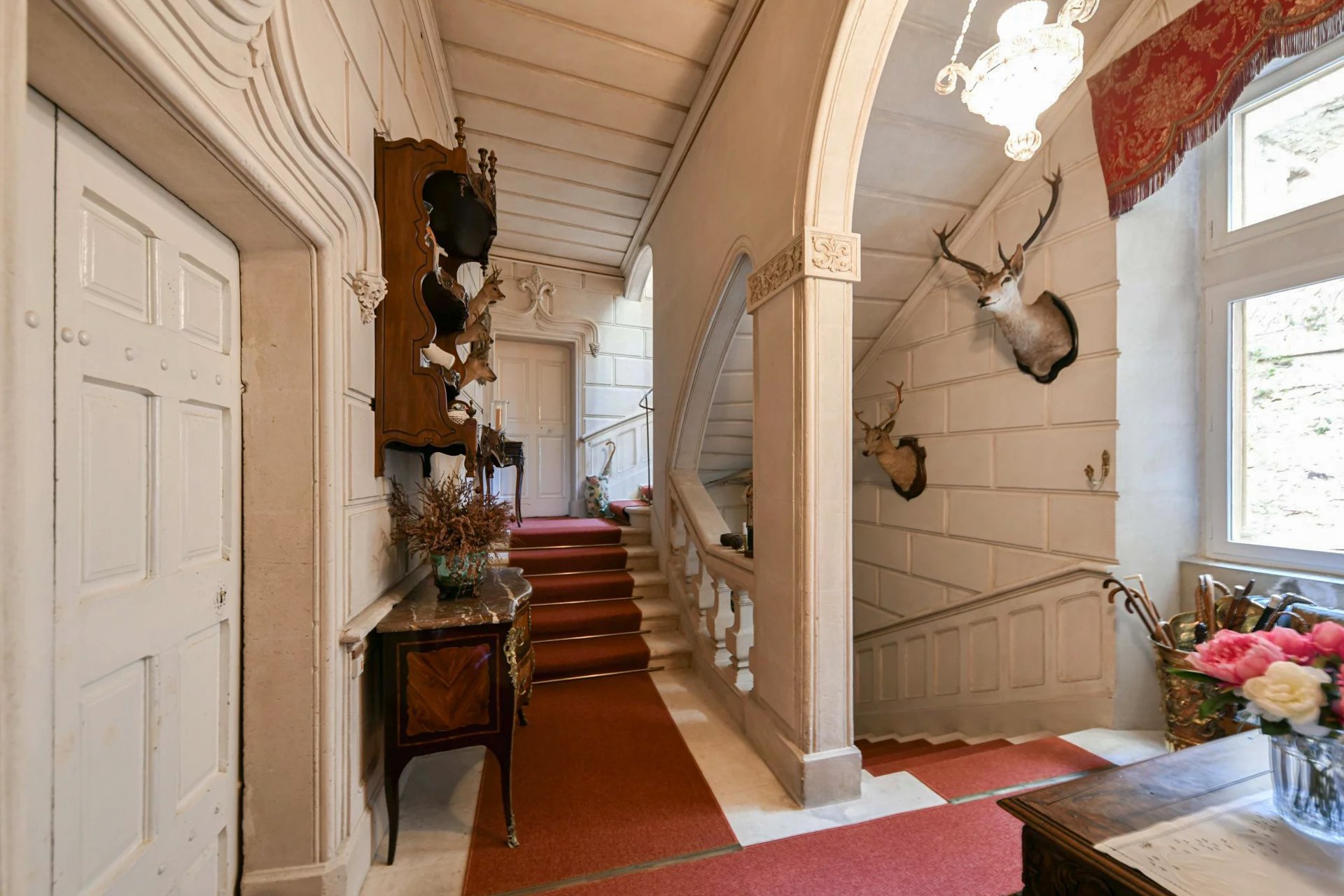 Zwei Eingänge führen in einen weitläufigen, gewölbten Salon mit einer Decke aus dem 17. Jahrhundert. Ein prächtiges Treppenhaus verbindet das Erdgeschoss mit dem Obergeschoss, das zwei Salons, einen eleganten Speisesaal mit Kamin und eine Bibliothek umfasst. Ein langer Flur erschließt ein Büro, die Küche sowie eine großzügige Hauptsuite von 100 m².