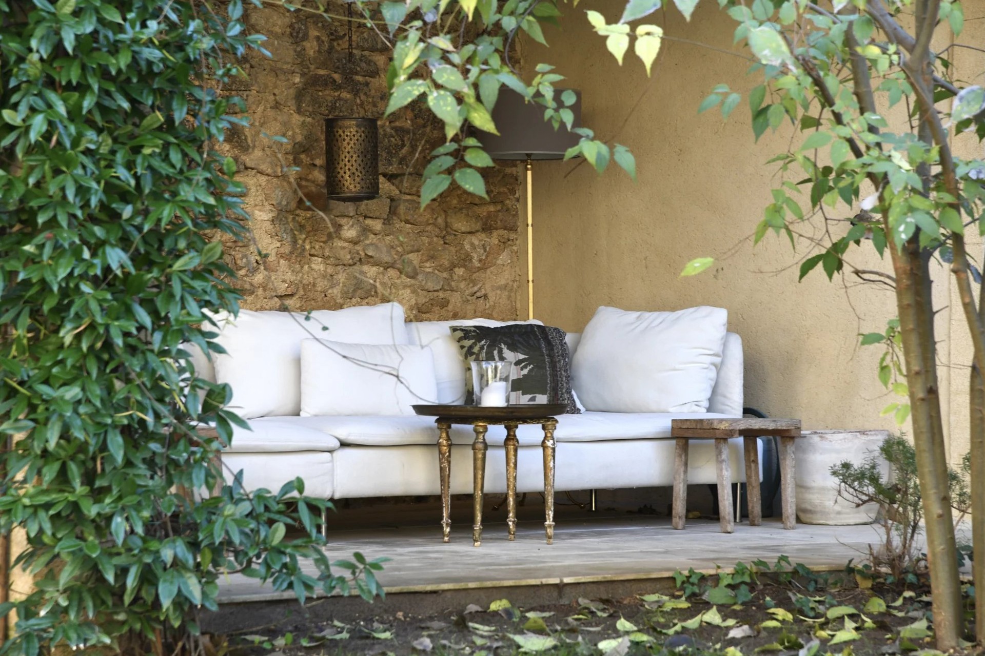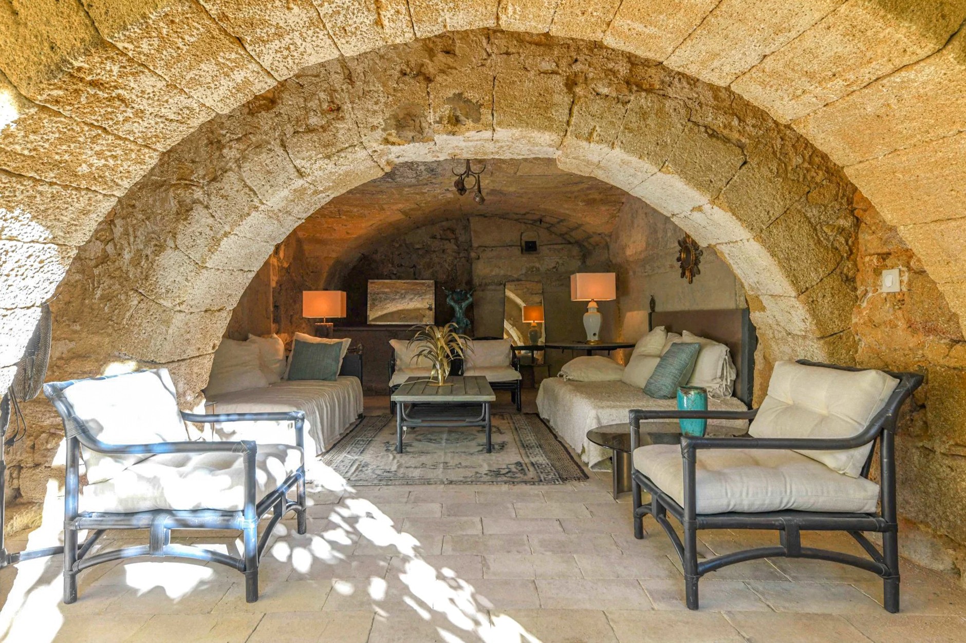 Der Pool erstreckt sich entlang des Gästehauses in optimaler Ausrichtung zum Hauptgebäude. Trockenmauern rahmen den Garten ein, der sich harmonisch in die mediterrane Vegetation einfügt. Ein weiterer überdachter Sommersalon beim Gästehaus bietet zusätzliche Rückzugsmöglichkeiten.