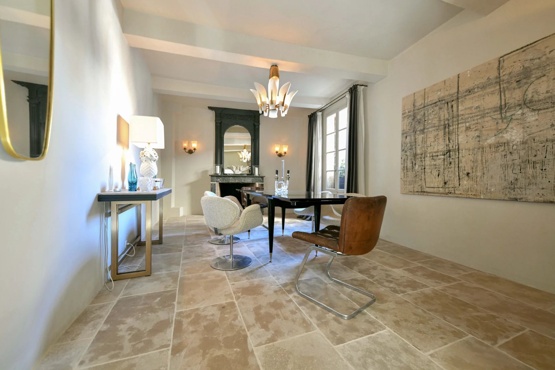 Im Obergeschoss empfängt ein 33,40 m² großer Salon mit Kamin und sichtbarer Balkendecke. Von hier erschließen sich zwei weitere Suiten (20 und 30 m²), jeweils mit eigenem Bad. Eine Küchenzeile und Terrassenzugang schaffen zusätzliche Unabhängigkeit – ideal für Gäste oder eine zweite Wohneinheit.