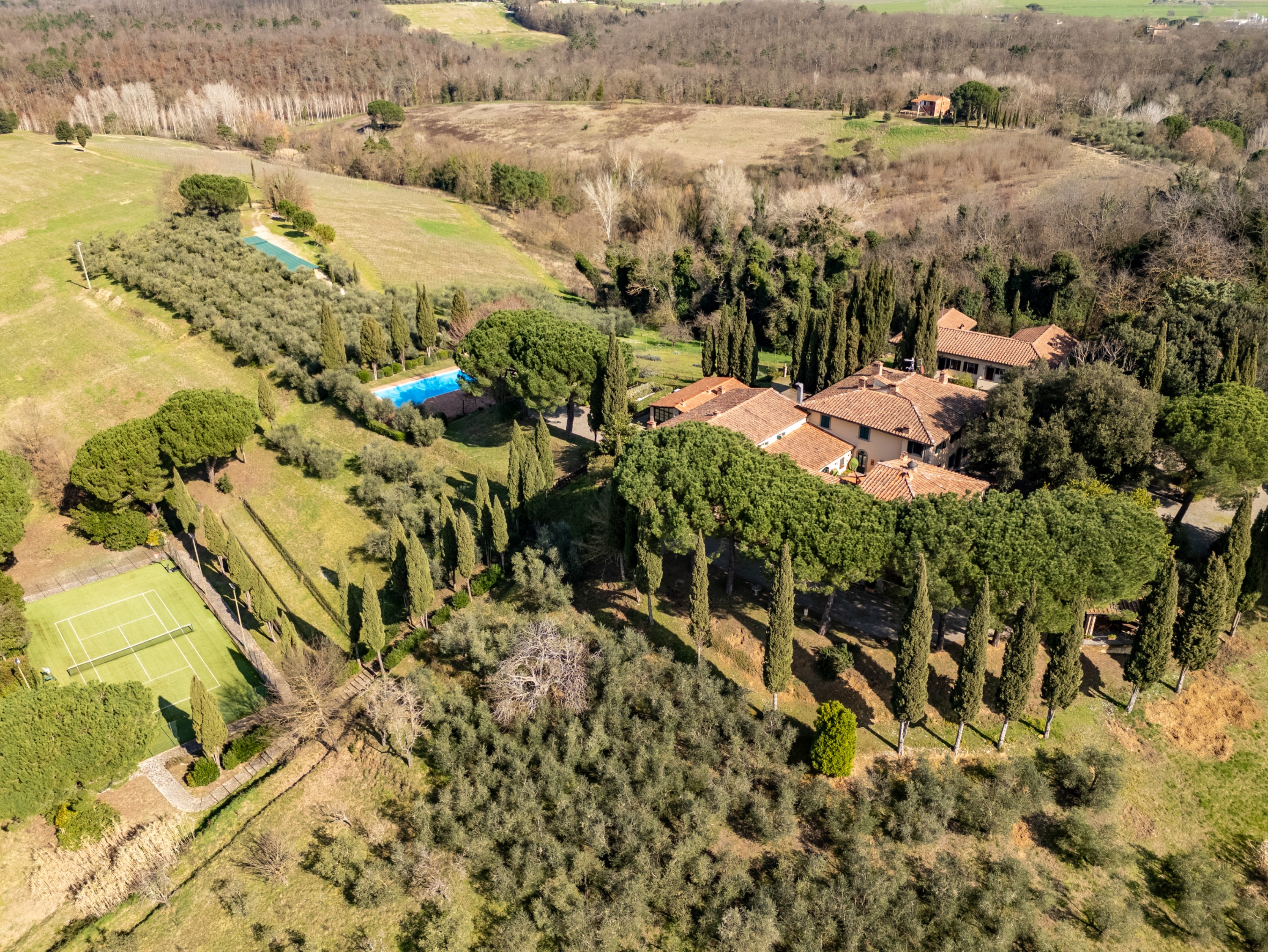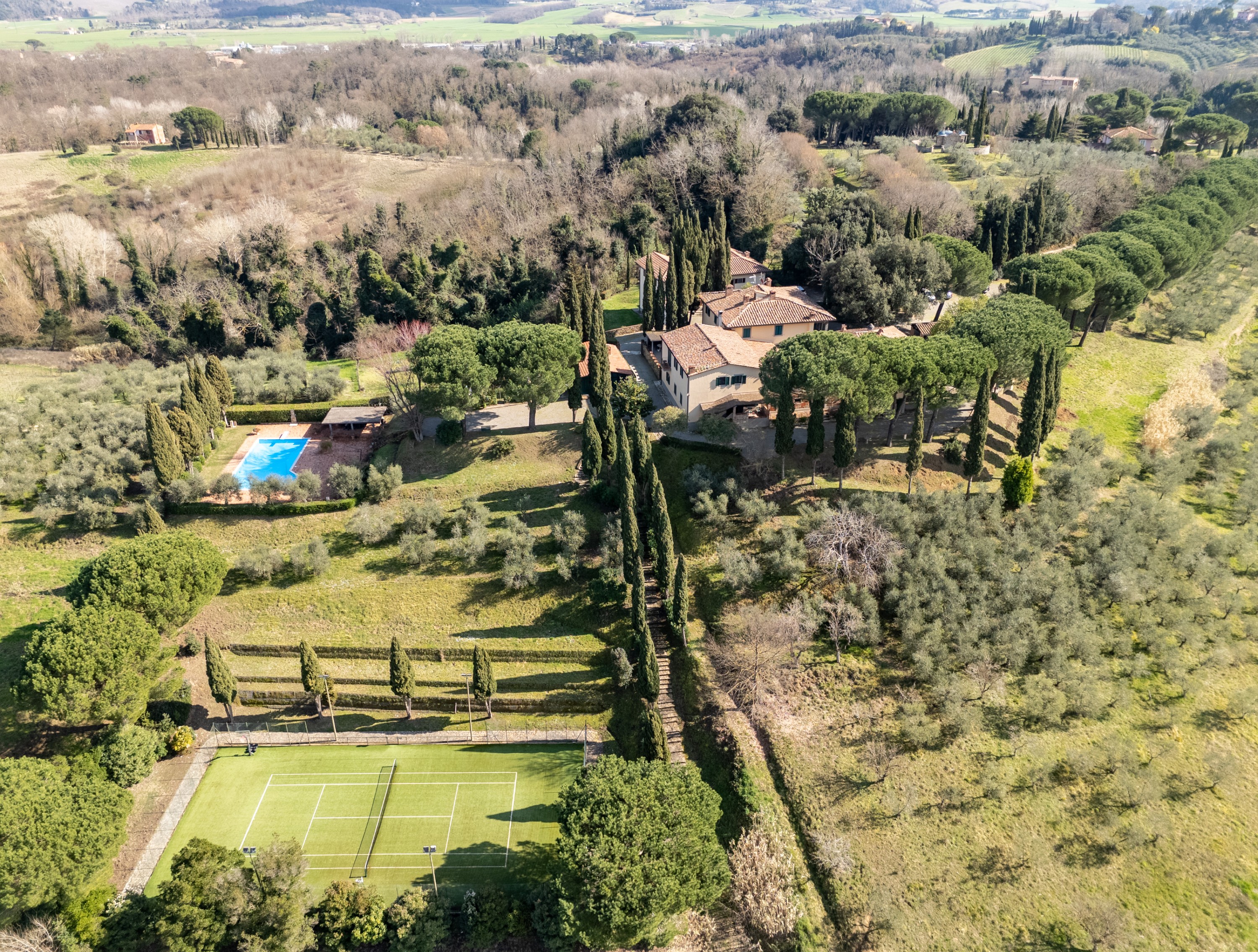 Inmitten der Hügellandschaft der Provinz Pisa gelegen, umfasst diese Liegenschaft eine Grundfläche von rund 30 Hektar. Das Anwesen vereint landwirtschaftliche Produktion mit einem etablierten Beherbergungsbetrieb und bietet ein hohes Maß an Privatsphäre.