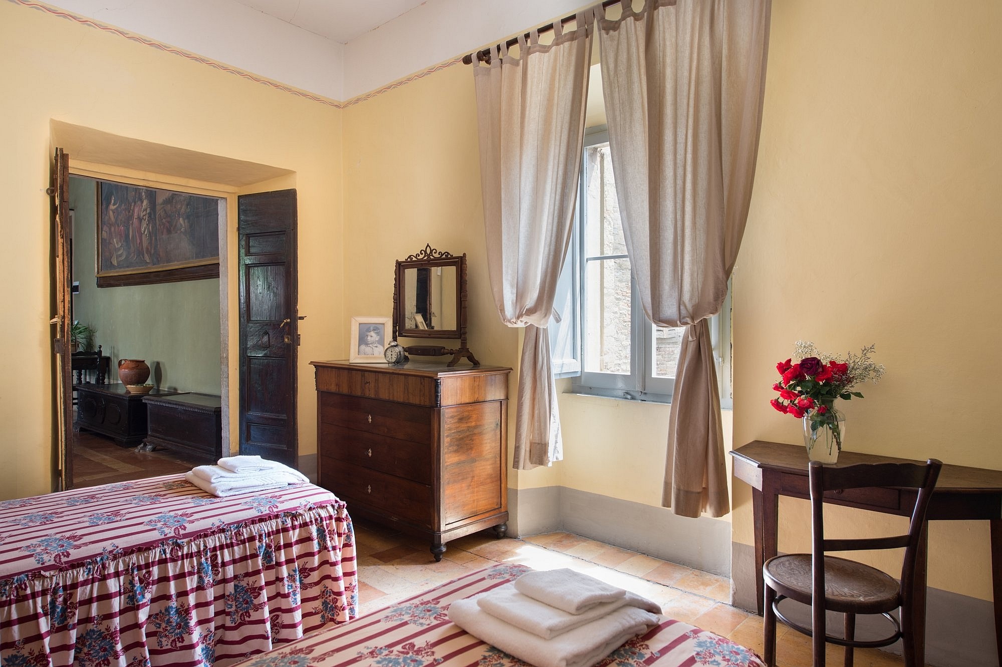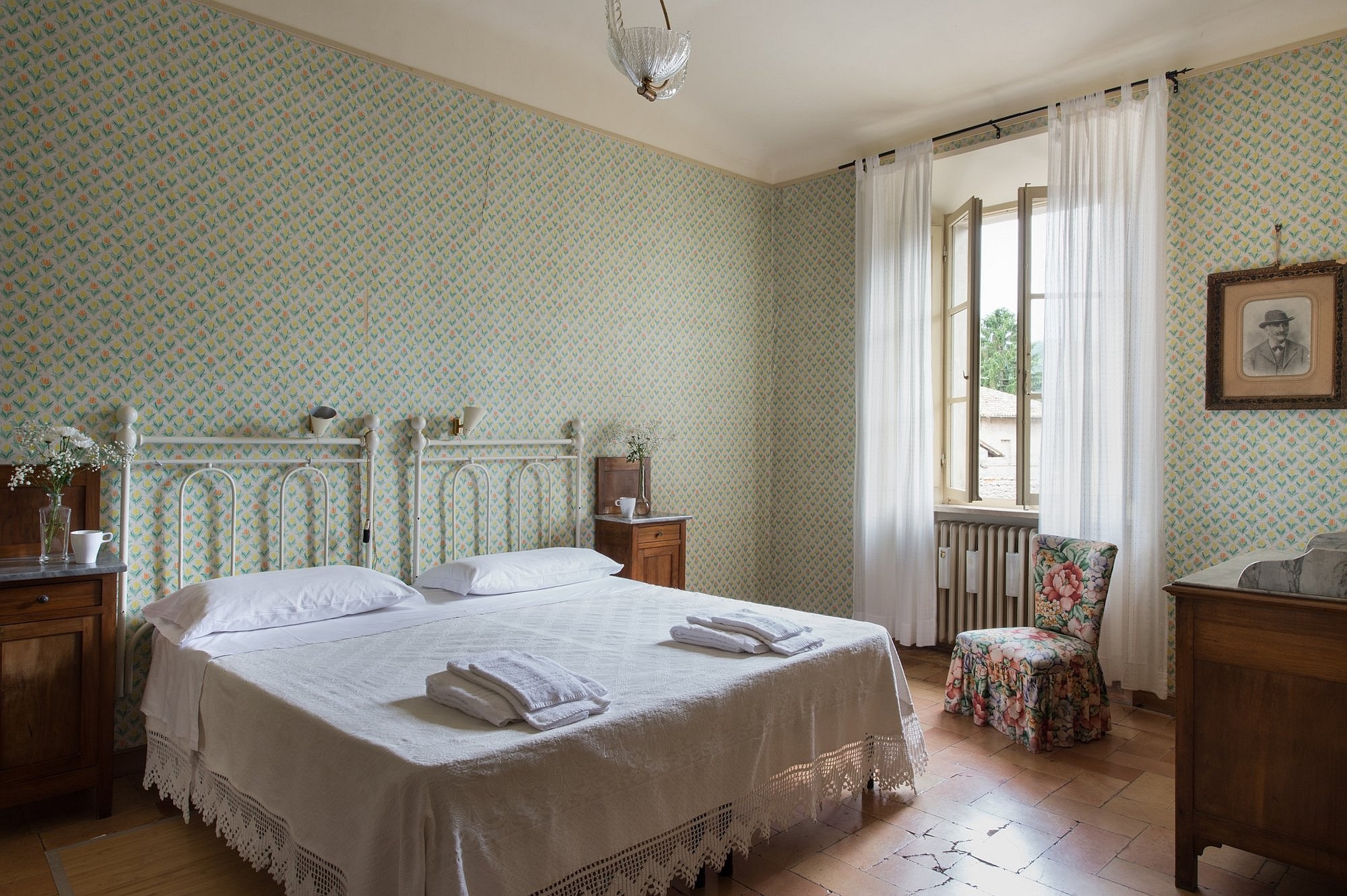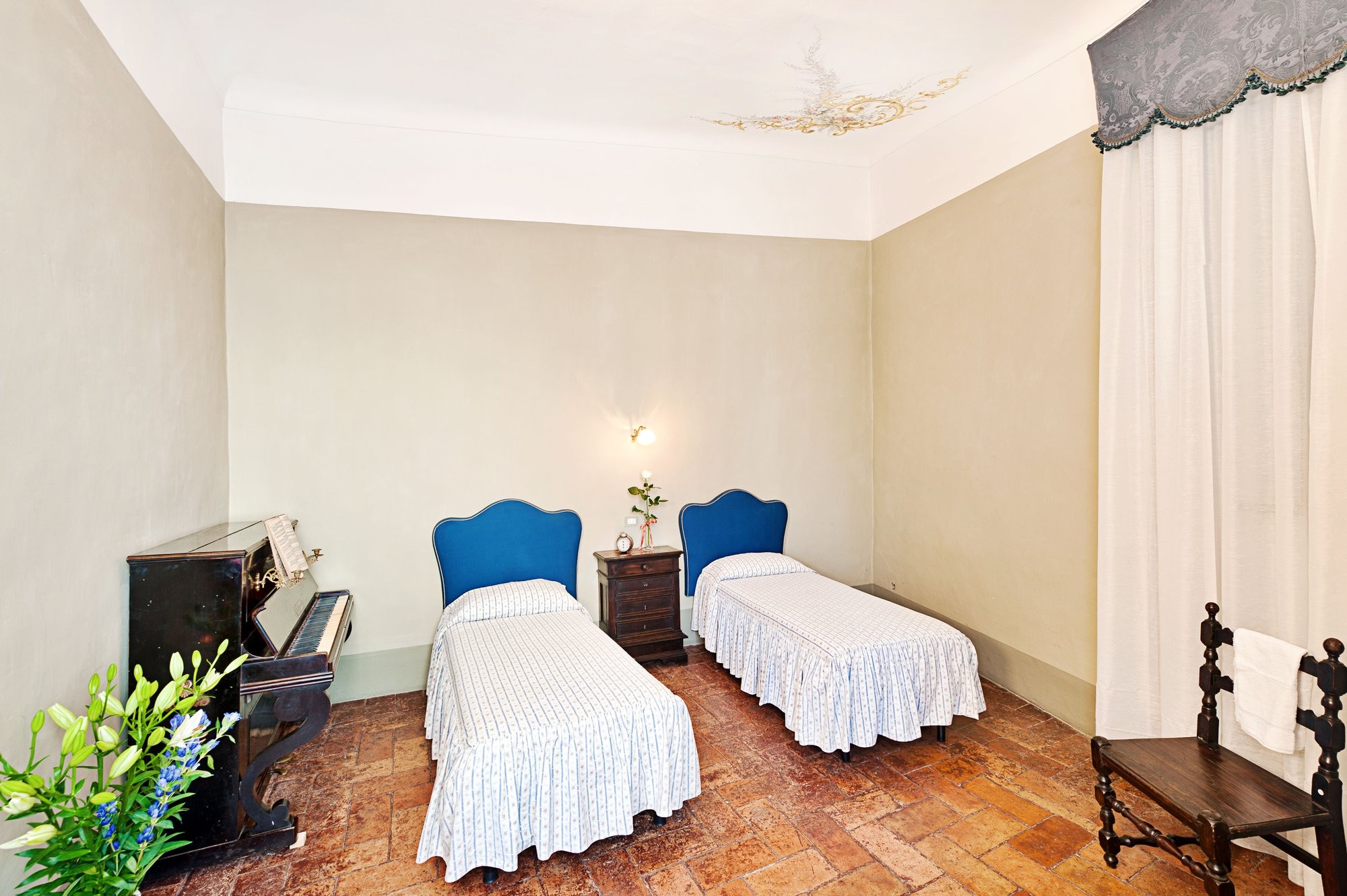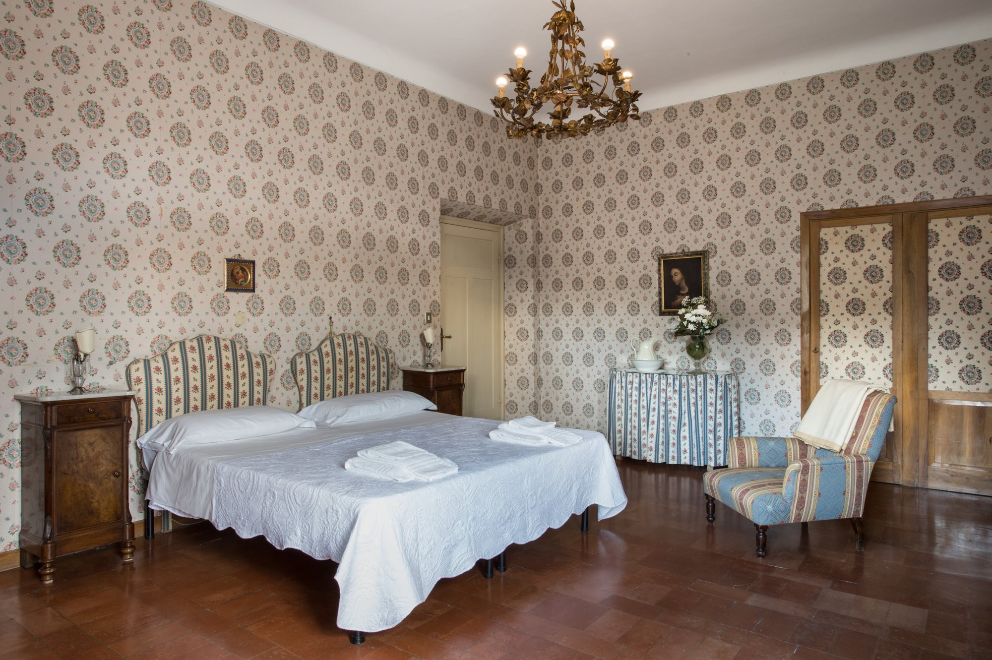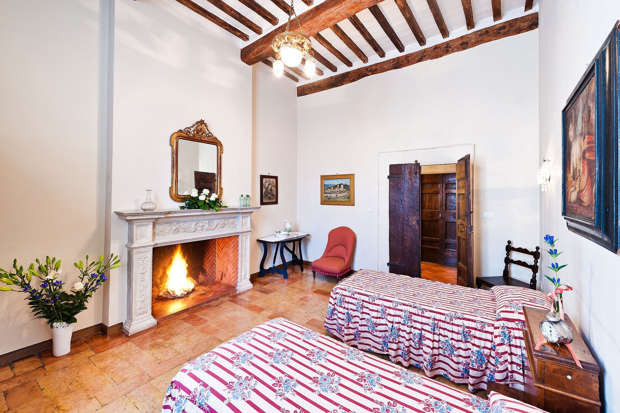 Der Palazzo verfügt über sechs luxuriöse Doppel-Suiten, jede mit eigenem Charakter und Blick ins Grüne. Fresken, antike Terrakottaböden oder freiliegende Balken prägen die Räume. Moderne en-suite Bäder sind elegant renoviert, hohe Decken und große Fenster verstärken das Gefühl, in einer adeligen Residenz zu wohnen.