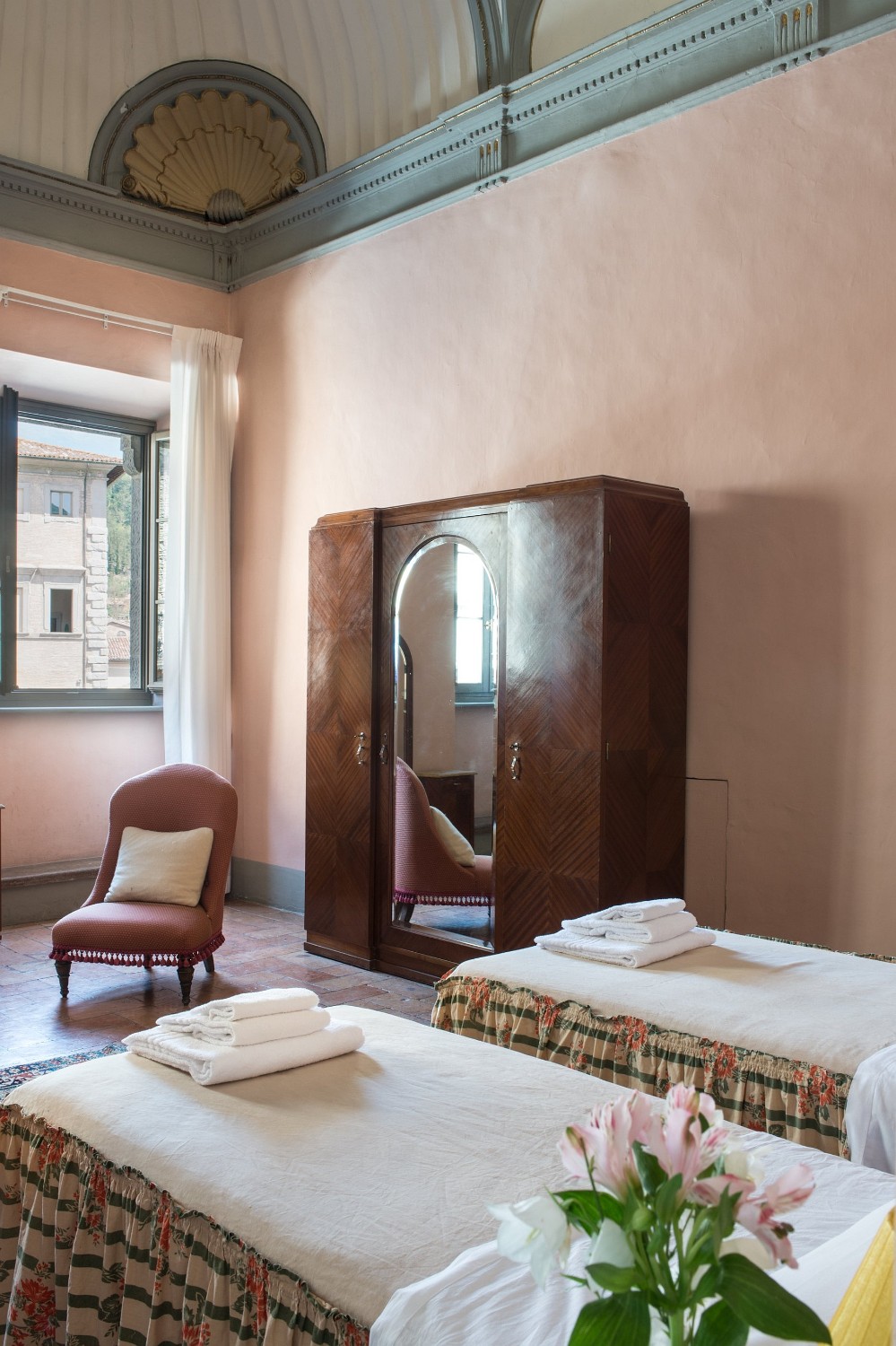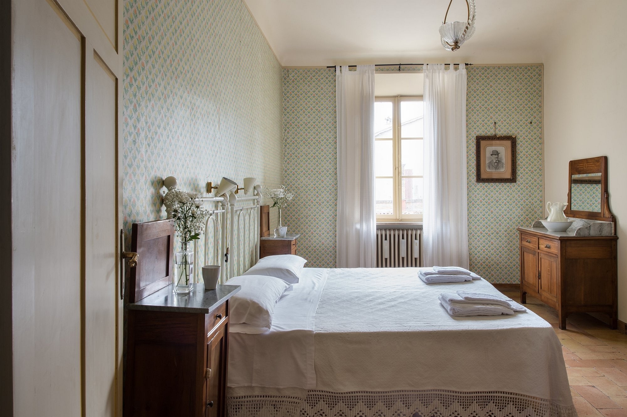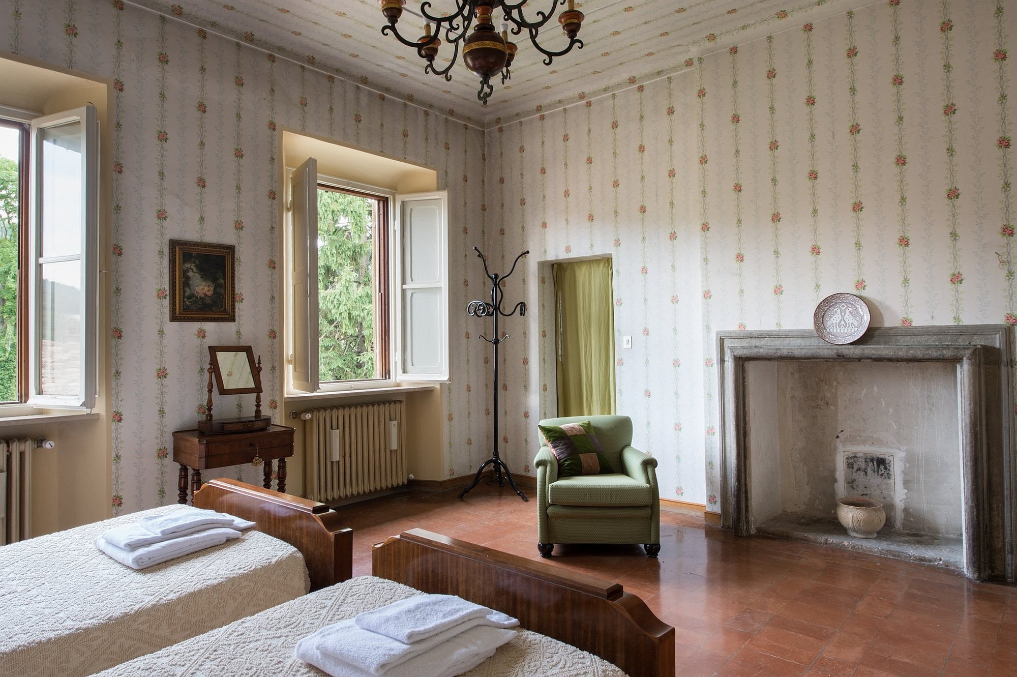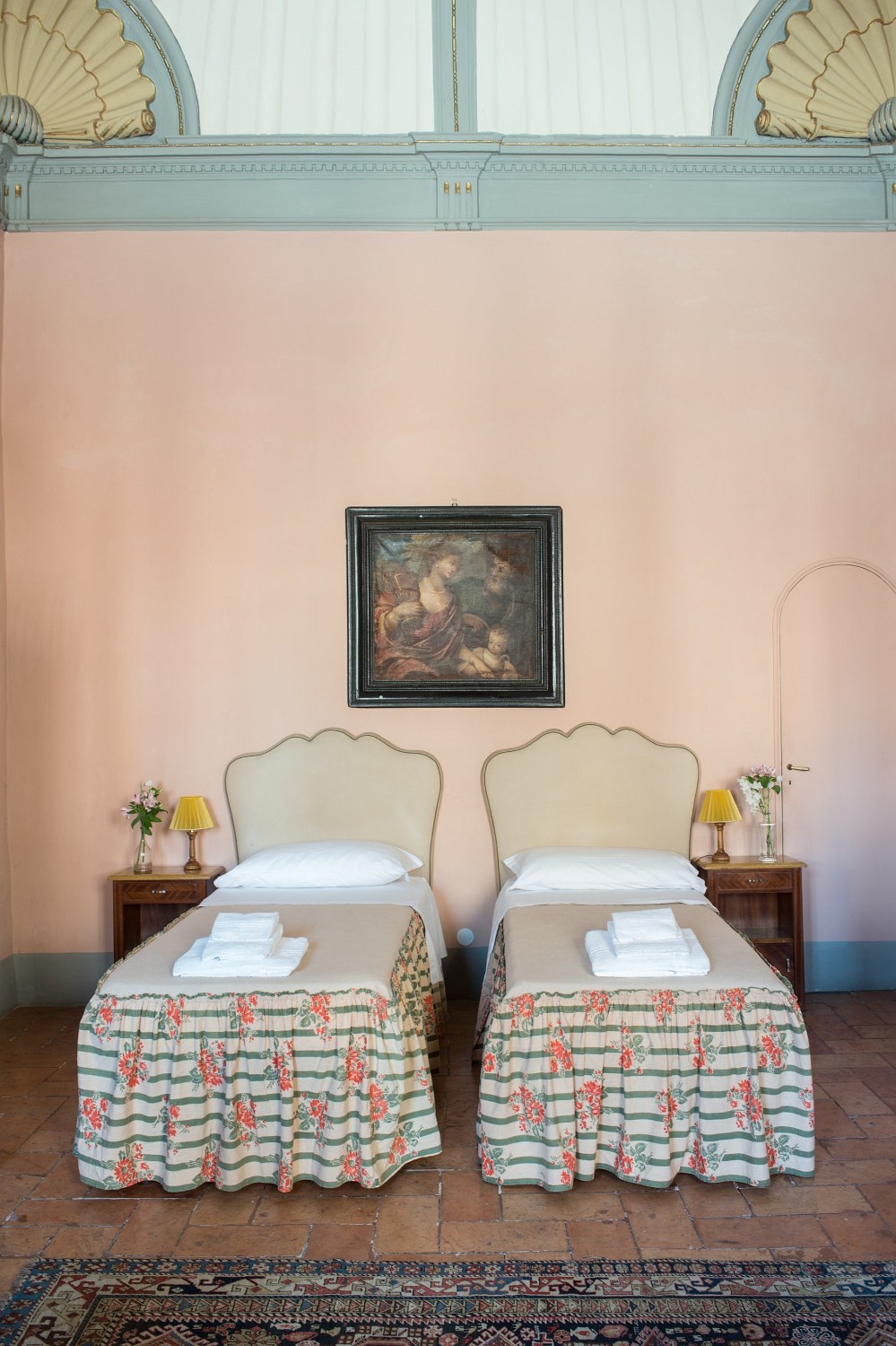 Der Palazzo verfügt über sechs luxuriöse Doppel-Suiten, jede mit eigenem Charakter und Blick ins Grüne. Fresken, antike Terrakottaböden oder freiliegende Balken prägen die Räume. Moderne en-suite Bäder sind elegant renoviert, hohe Decken und große Fenster verstärken das Gefühl, in einer adeligen Residenz zu wohnen.