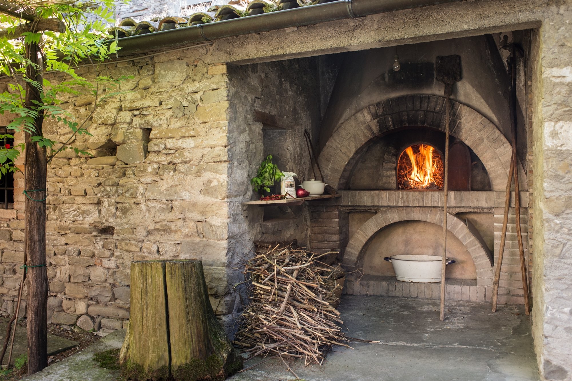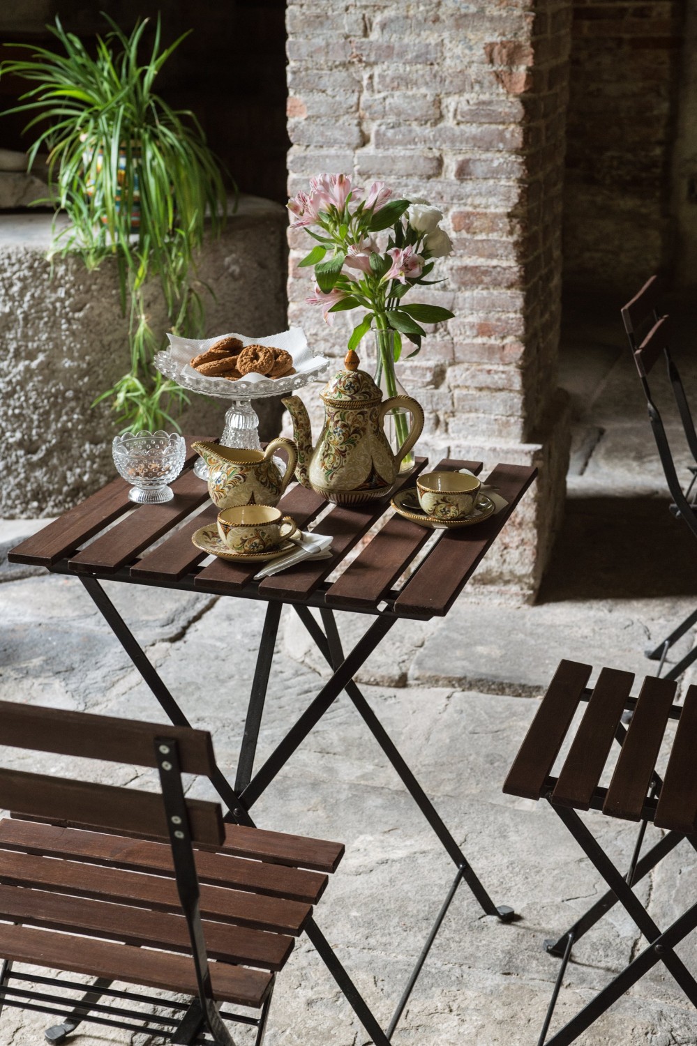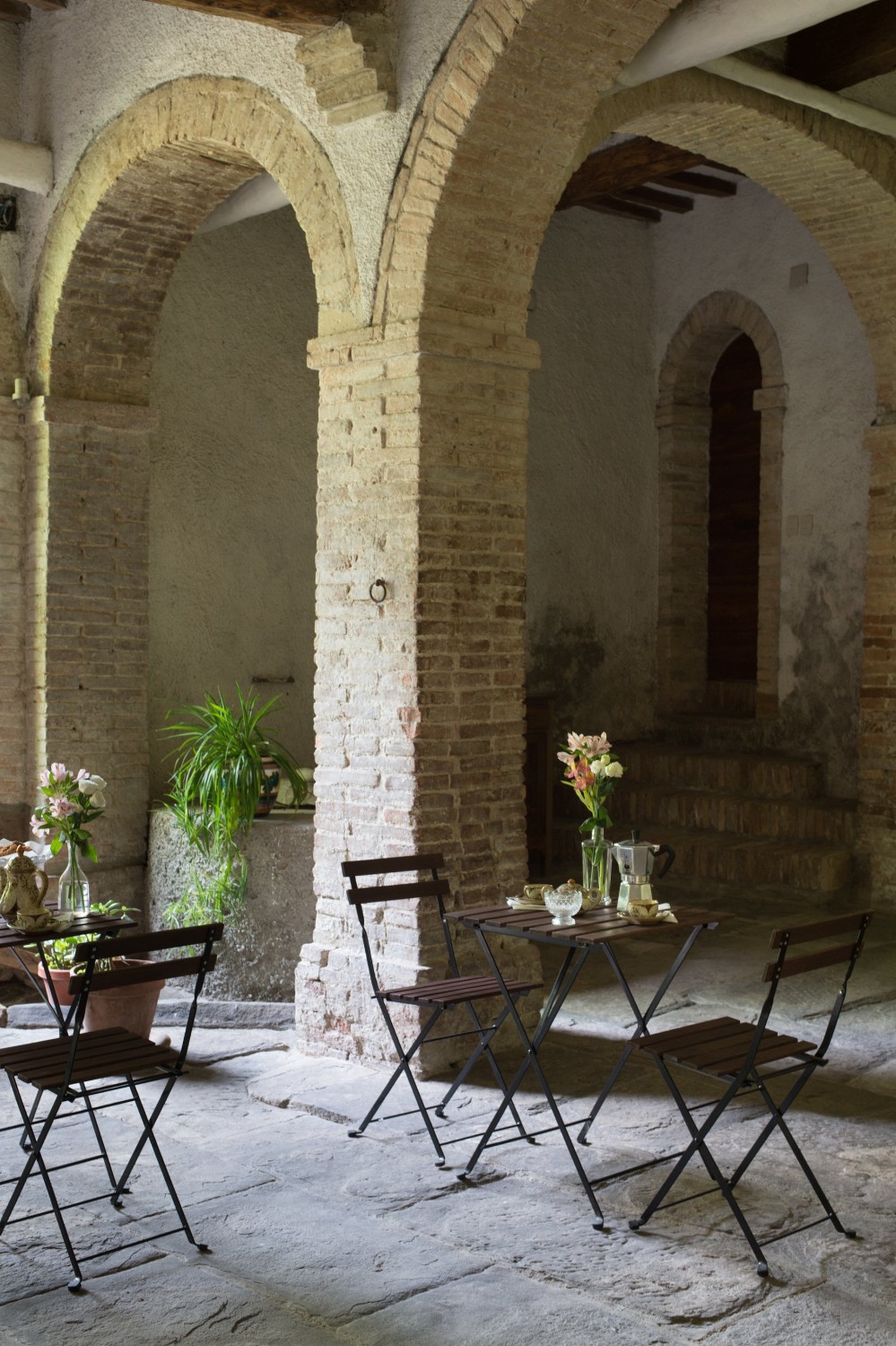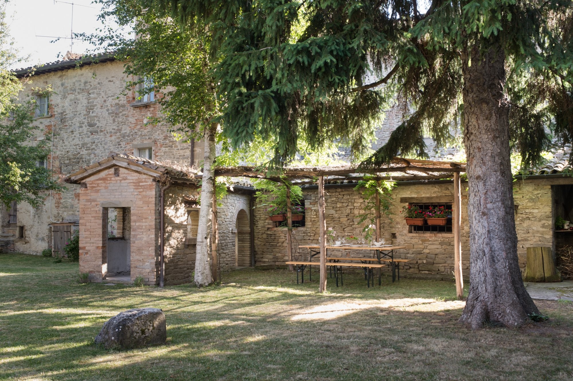 Der Innenhofgarten ist eine ruhige Oase mit Rosen, Zitrusbäumen, Pergola und einem antiken Brunnen. Kleine Balkone und Panoramafenster bieten Ausblicke auf das Dorf und die Apenninenhügel.