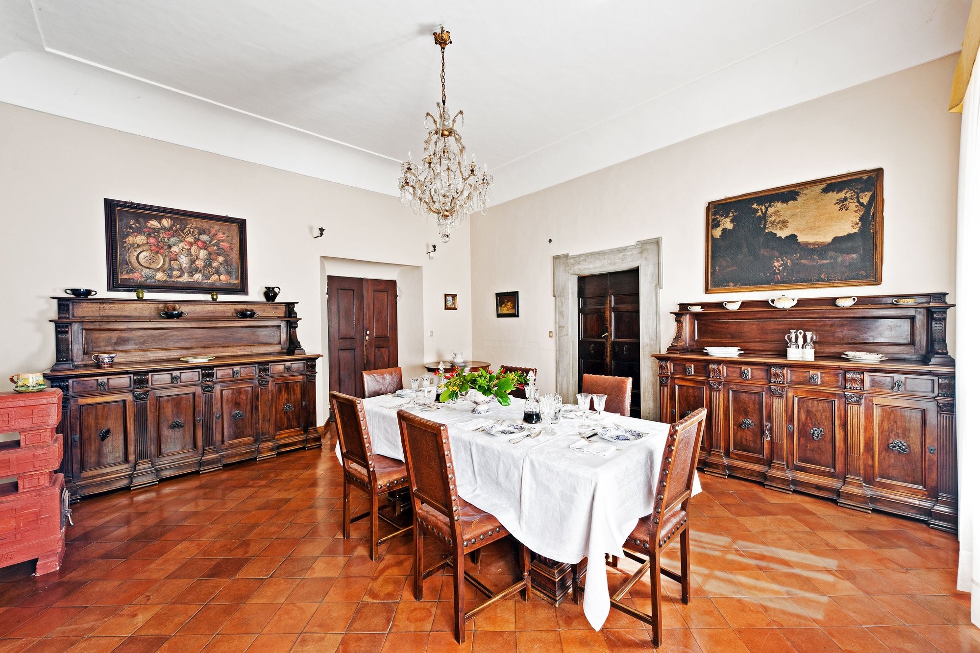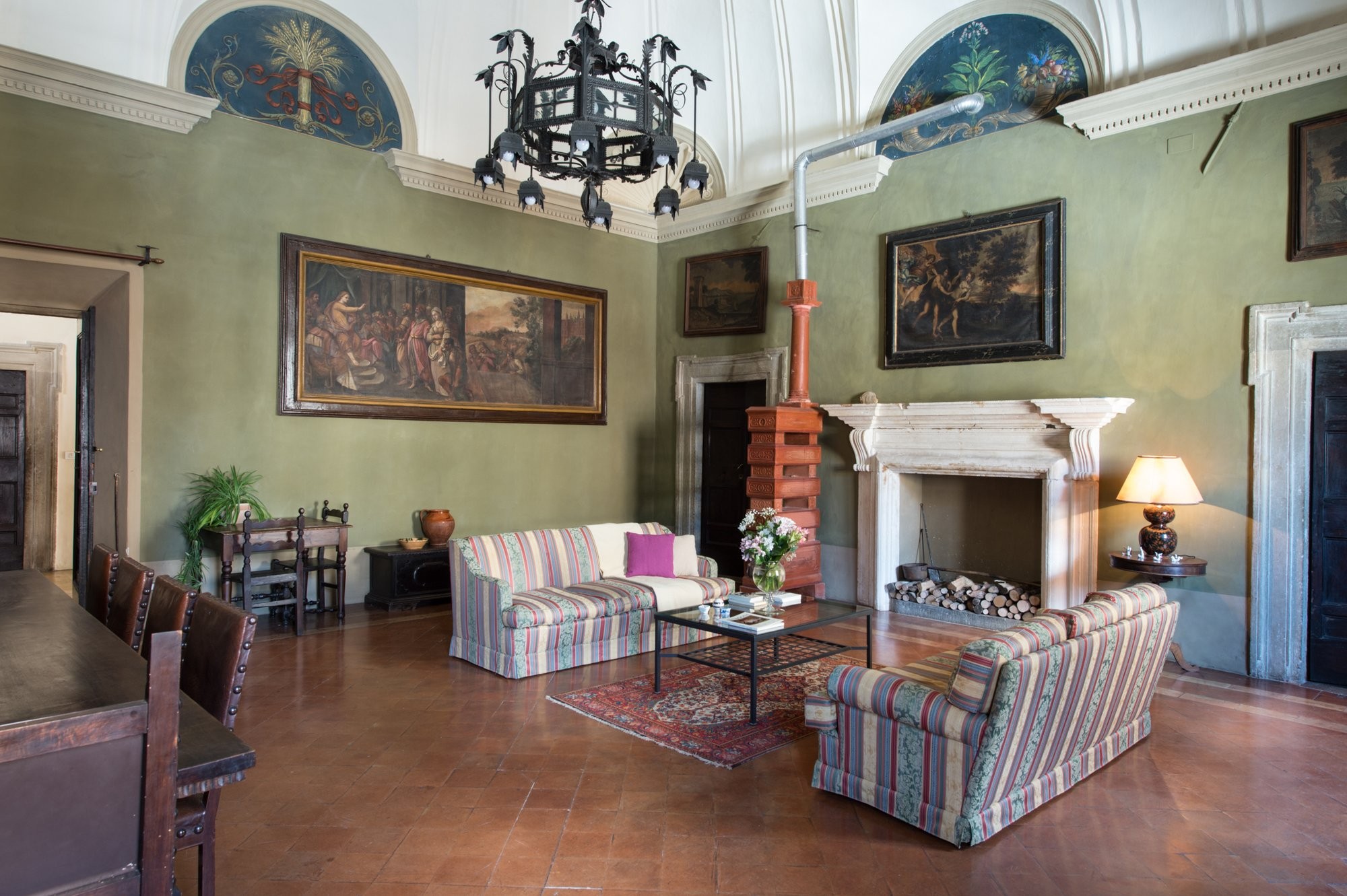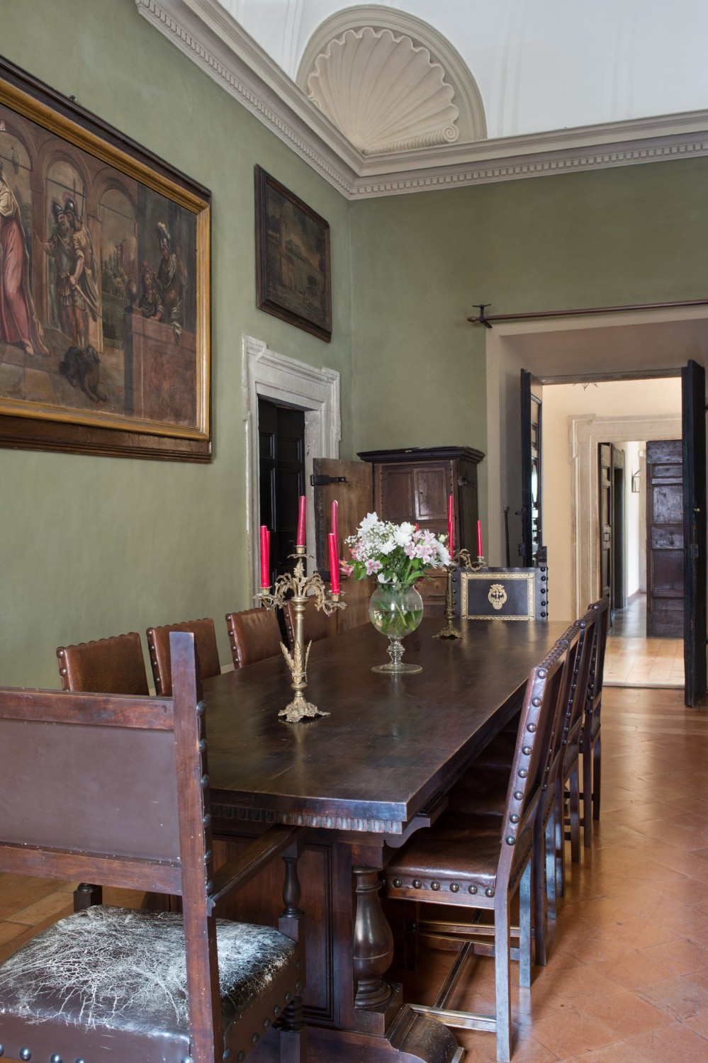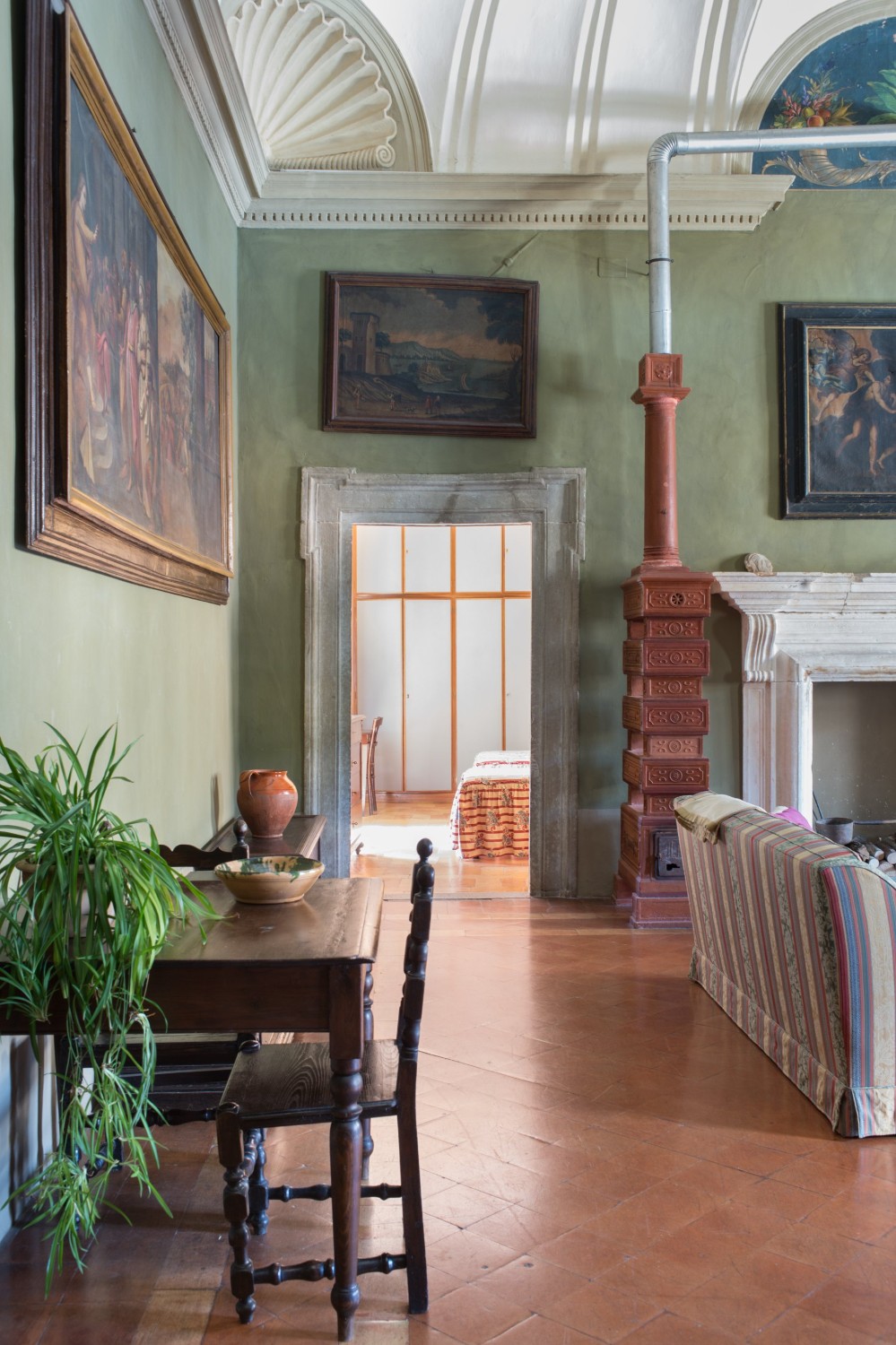 Der linke Flügel beherbergt den Piano-Nobile-Saal mit originalen Renaissance-Ornamenten, hohen handbemalten Fresken und Wänden, die 500 Jahre italienischer Geschichte erlebt haben. Der rechte Flügel erstreckt sich über zwei Stockwerke und verbindet großzügige Wohnräume mit historischem Charme und modernem Komfort. Licht fällt durch hohe Fenster auf gewölbte Durchgänge, Zierleisten und dekorierte Türen – jedes Detail erzählt von der adeligen Vergangenheit des Hauses.