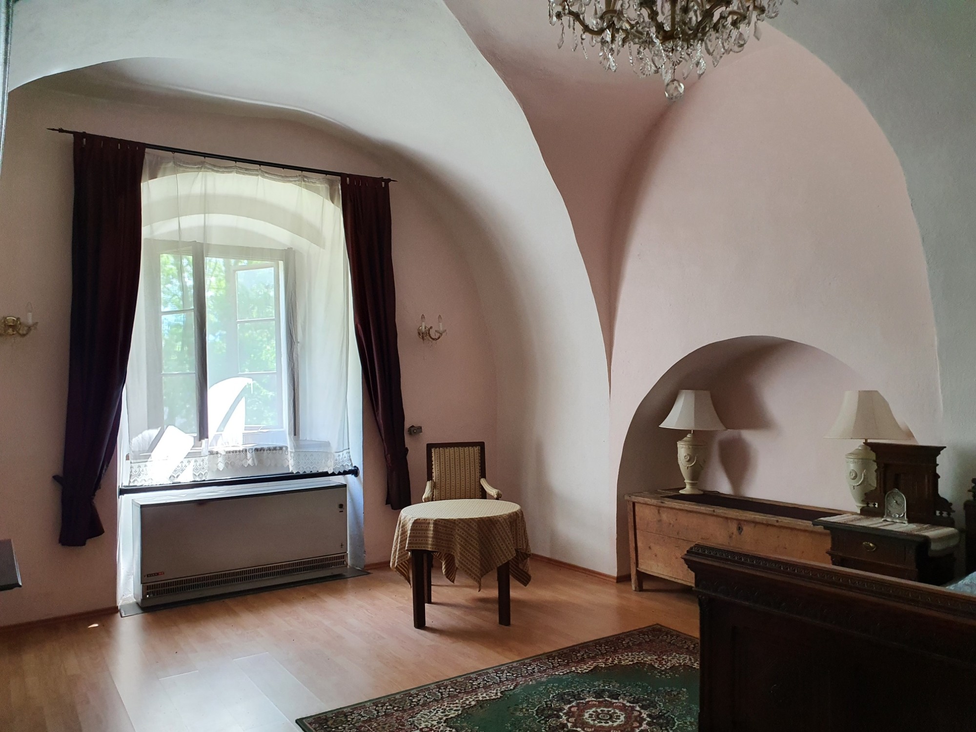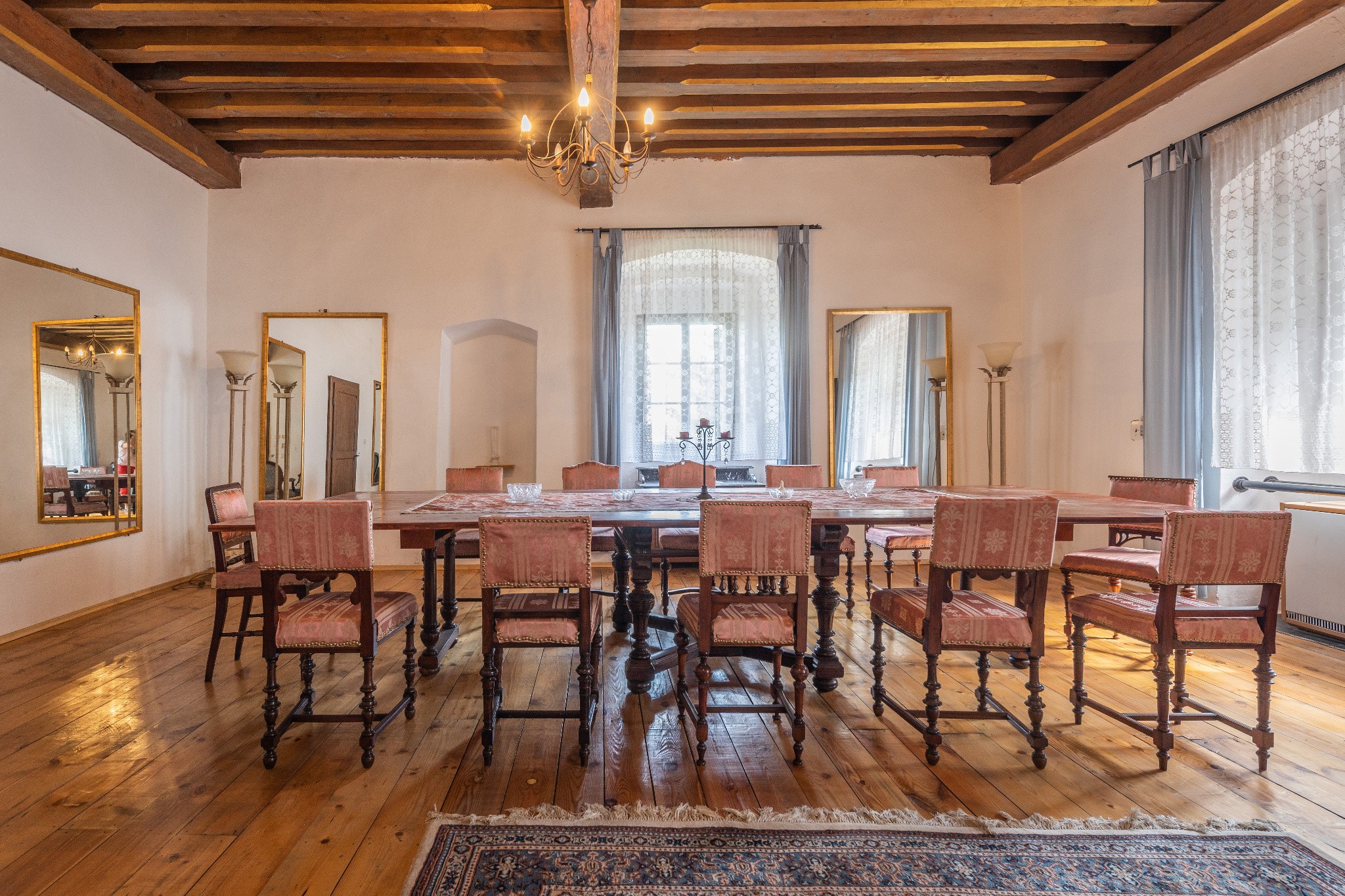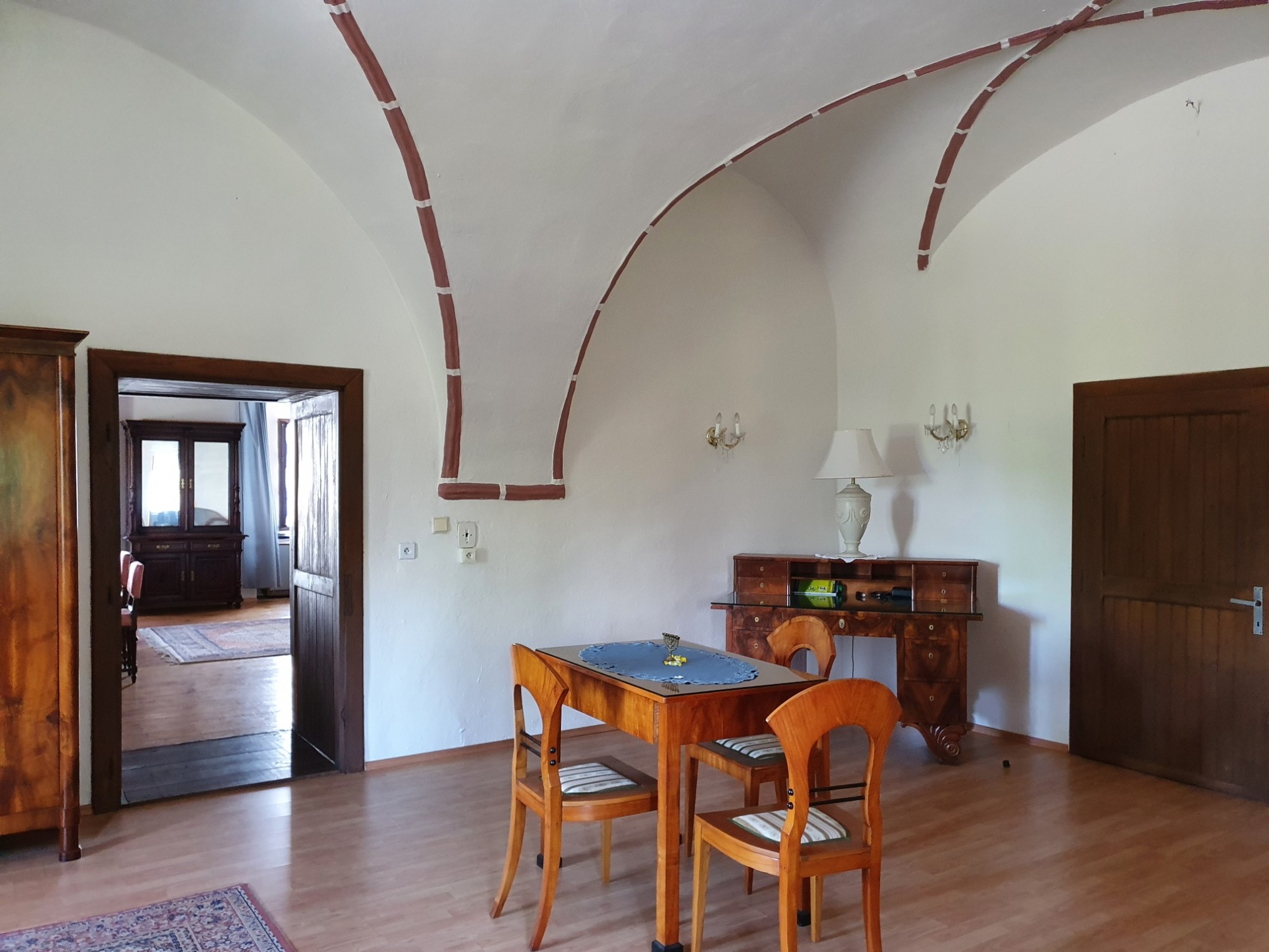 • Großer Saal: Der Hauptraum besticht durch renovierte Holzdielen und eine klassische Tramdecke.