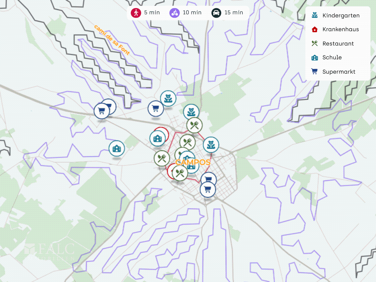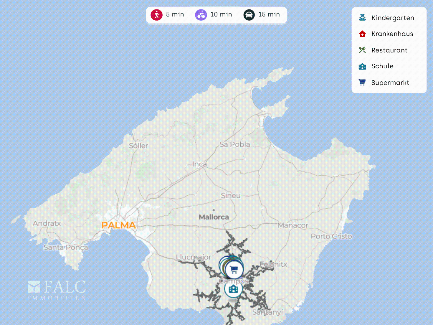 Campos ist ein gewachsenes Dorf im Süden Mallorcas mit intakter Nahversorgung, kurzen Wegen und typisch mallorquinischem Ortsgefühl. Der Strand Es Trenc ist in etwa 15 Fahrminuten erreichbar, der Flughafen Palma in rund 25 bis 30 Minuten.