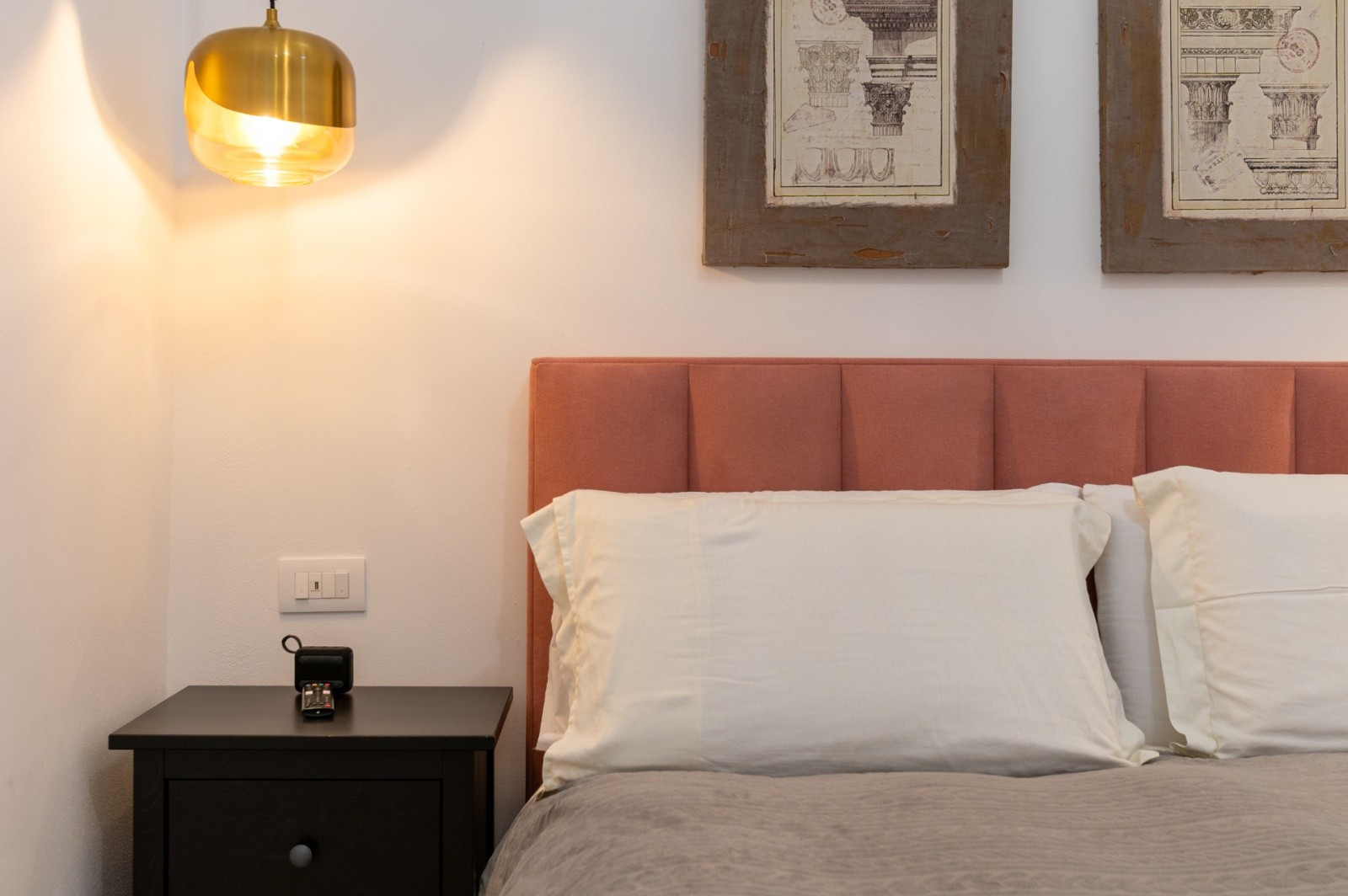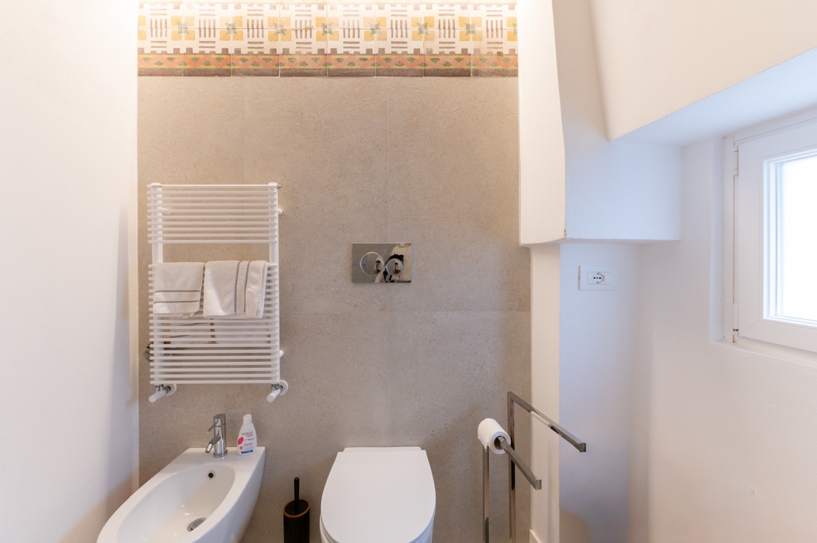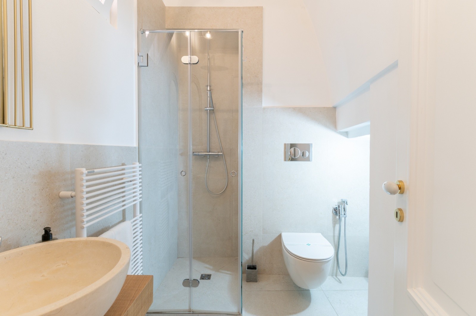 Das erste Obergeschoss ist sowohl intern angebunden als auch über eine eigene Treppe erreichbar. Es umfasst einen kleinen Eingangsbereich sowie zwei unabhängig nutzbare Schlafzimmer mit jeweils eigenem Bad. Eines der Zimmer zeichnet sich durch eine historisch dekorierte Gewölbedecke, einen kleinen Balkon zur Altstadt und ein großzügiges Bad mit Badewanne aus. Das zweite Schlafzimmer ist ebenfalls separat angelegt und verfügt über ein eigenes Bad. Ergänzt wird diese Ebene durch eine kleine gemeinschaftliche Teeküche.