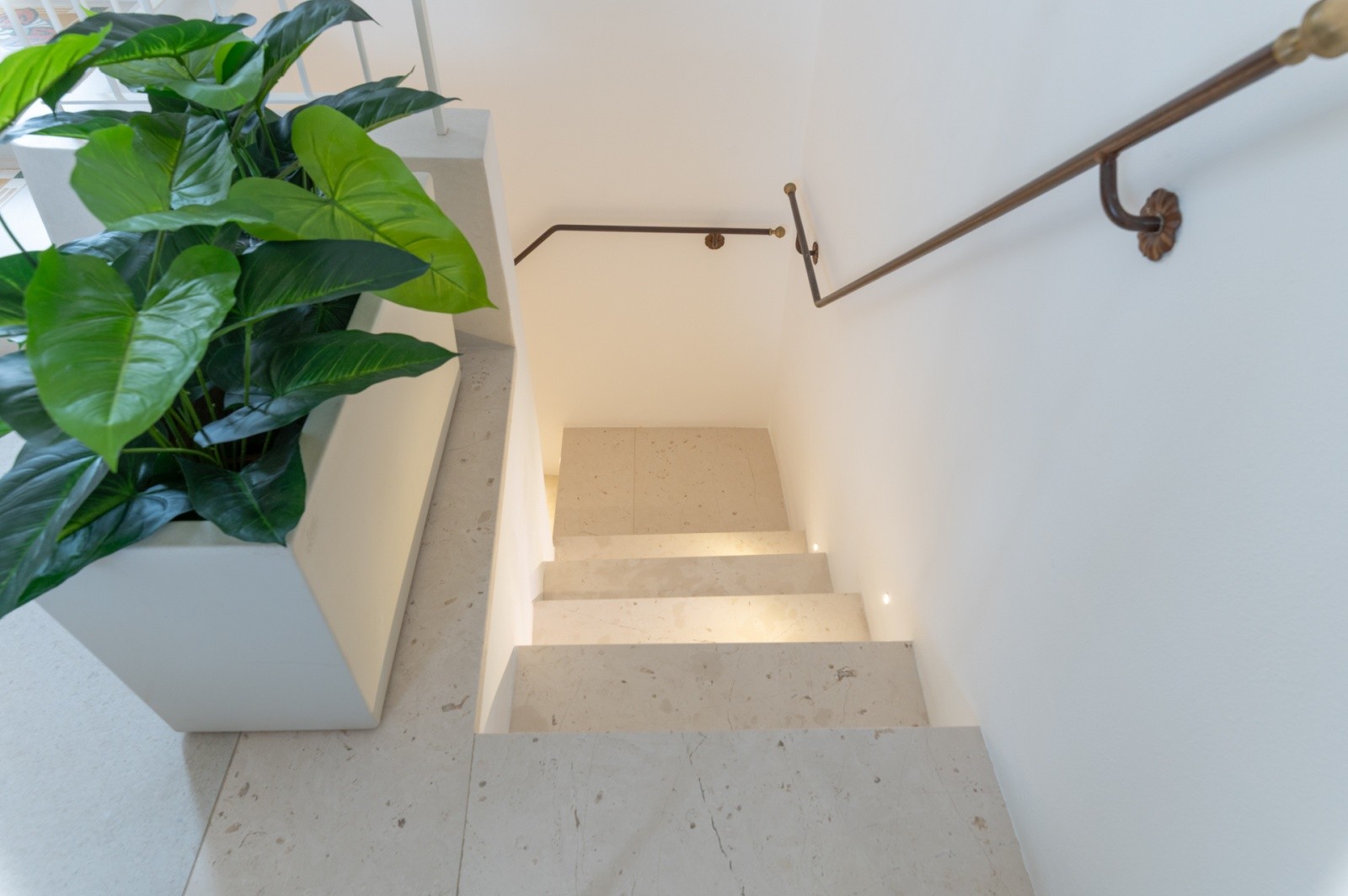 Im obersten Geschoss befinden sich eine offen gestaltete Küche sowie ein Essbereich mit Blick über die Dächer der Altstadt. Von hier aus führen Zugänge zu den Panoramaterrassen. Die Installation eines weiteren Whirlpools mit Ausblick in Richtung Meer wäre technisch umsetzbar.