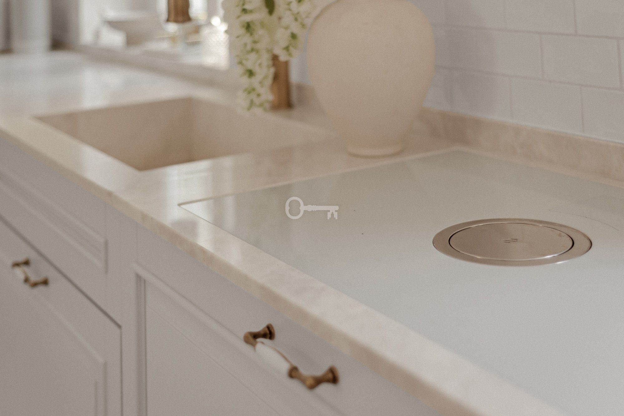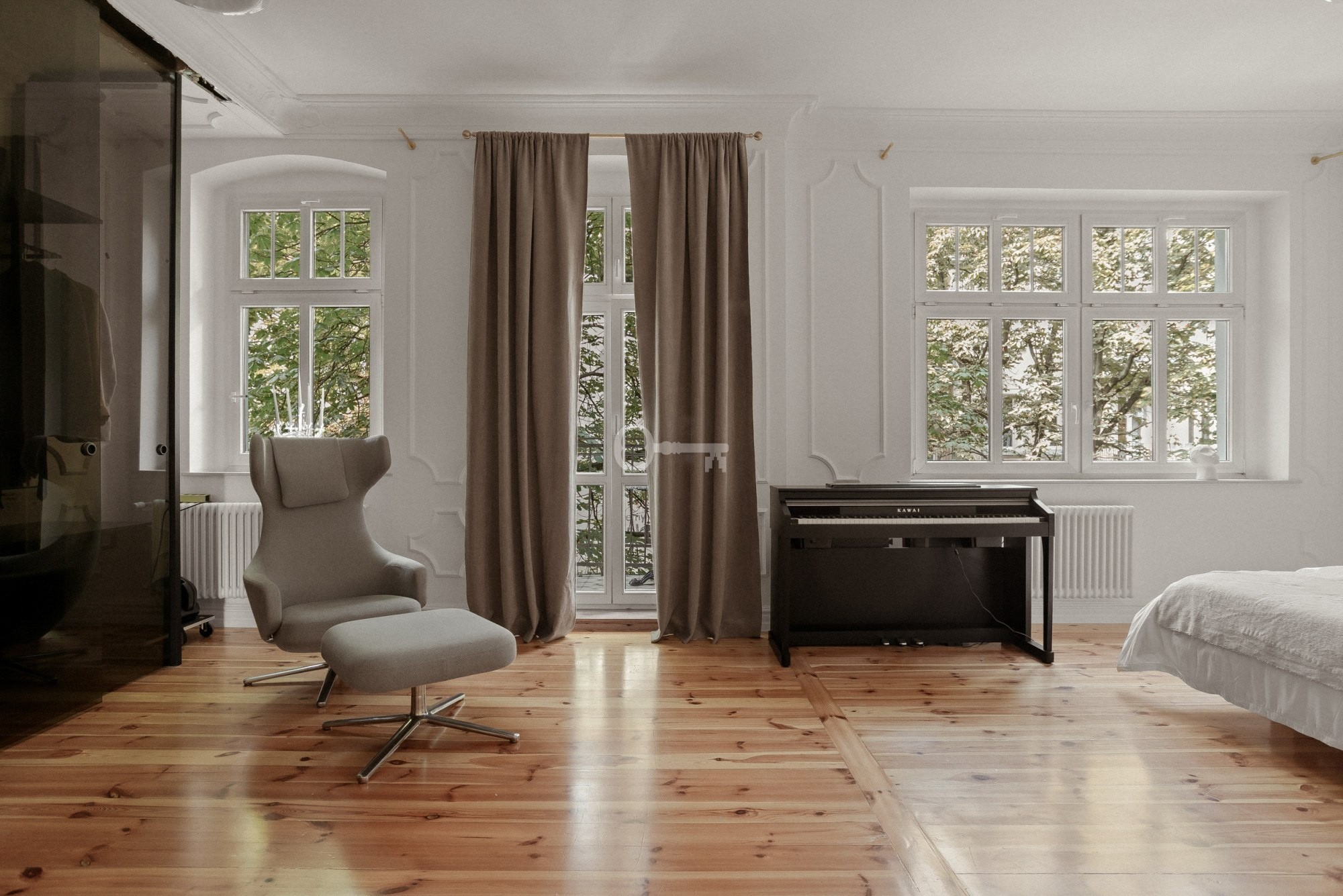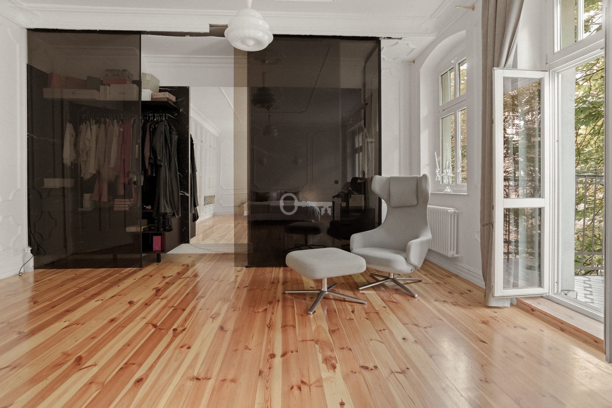 Aktuelle Raumaufteilung: Wohnzimmer, separate Küche mit Kochinsel, Schlafzimmer mit Ankleide, Bad, Diele. Der ursprüngliche Grundriss mit vier Zimmern lässt sich wiederherstellen.