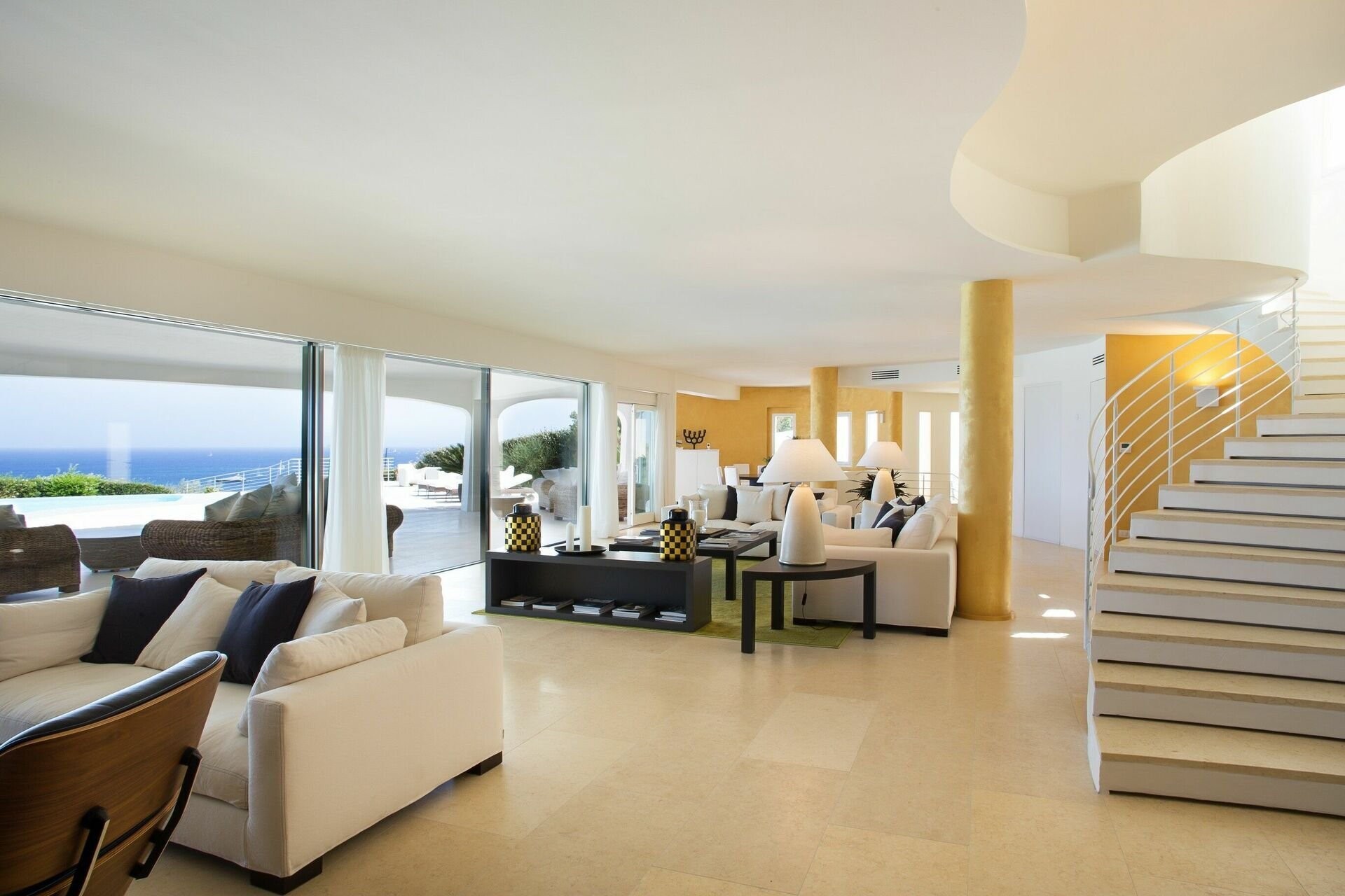 Die Architektur ist klar und minimalistisch, mit großzügigen Räumen und fließendem Übergang zwischen Innen- und Außenbereichen. Der zentrale Wohnbereich umfasst etwa 200 m² und öffnet sich zu einer überdachten Terrasse ähnlicher Größe. Von hier aus lassen sich die Bucht, die Yachten im Hafen und die nahegelegene Piazzetta mit Restaurants und Boutiquen überblicken.