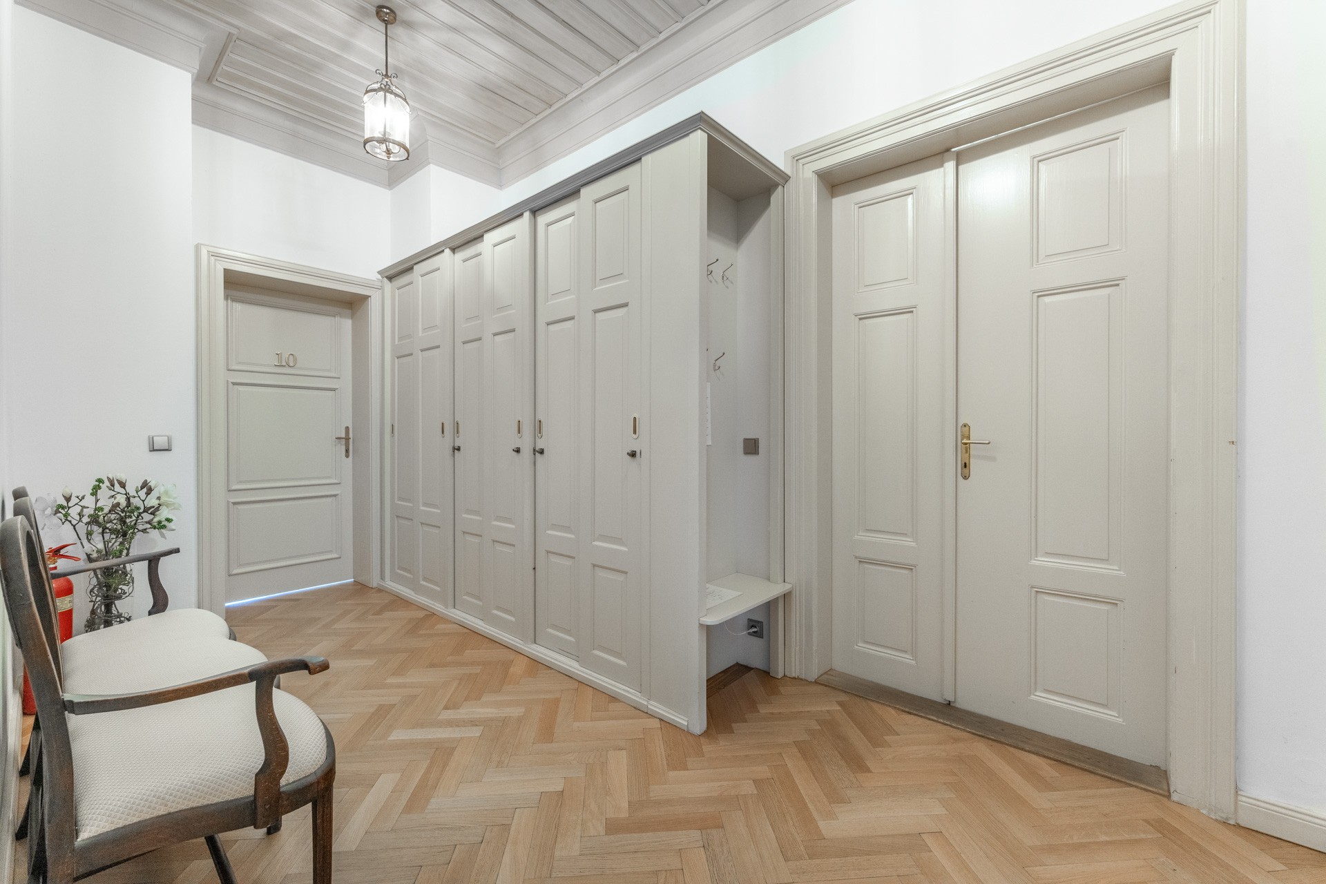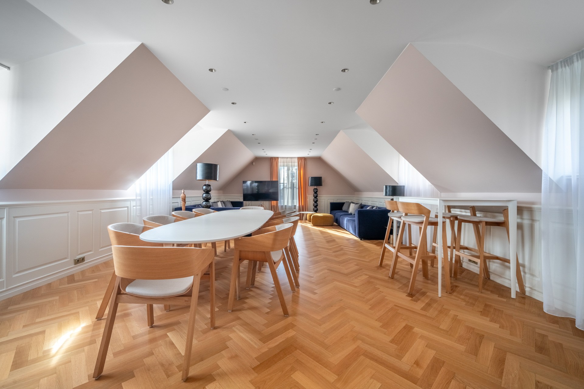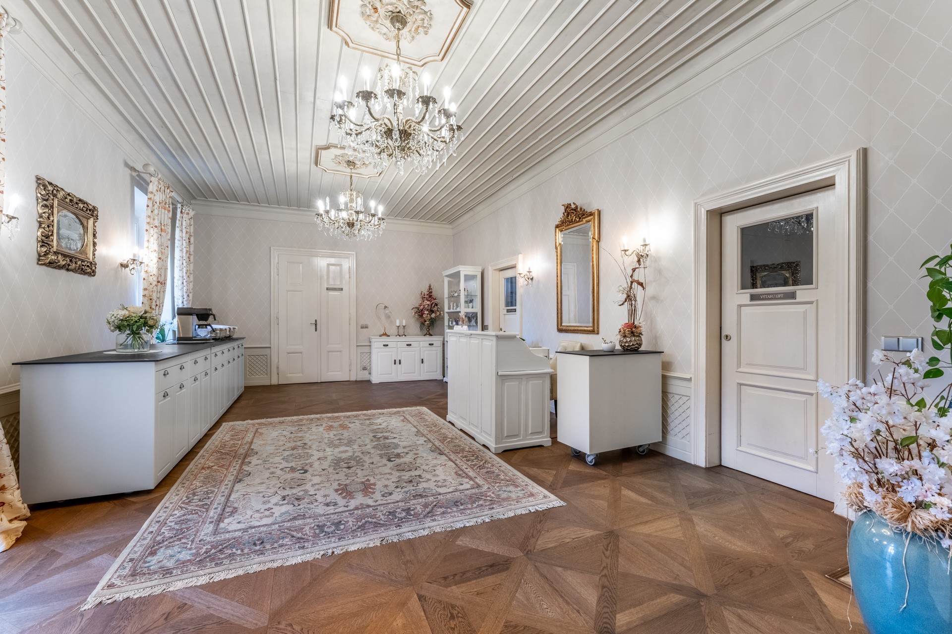 Im Erdgeschoss befindet sich ein privates Apartment der Eigentümer mit Büro, Bar, Weinkeller, Bibliothek, Essbereich und funktionalen Räumen. Zwei separate Küchen sind professionell ausgestattet. In den Obergeschossen gibt es weitere Salons, zehn Schlafzimmer mit eigenen Bädern, Wellnessbereiche mit Whirlpool, Sauna, Massageraum und einen beheizten Innenpool. Parkmöglichkeiten sind in der Garage für vier Fahrzeuge, auf dem Grundstück für mindestens acht Autos sowie am nahegelegenen Parkplatz beim Trnováer Kirchplatz für 15 Fahrzeuge vorhanden.