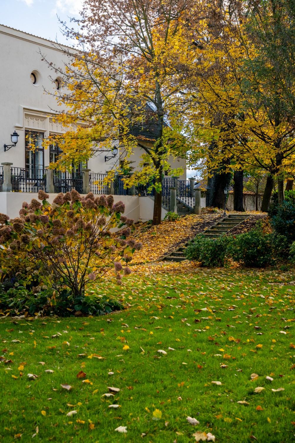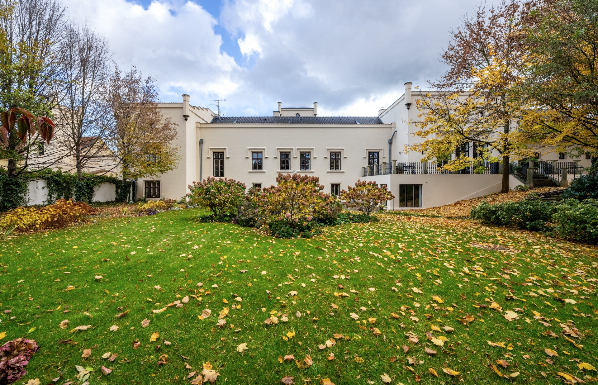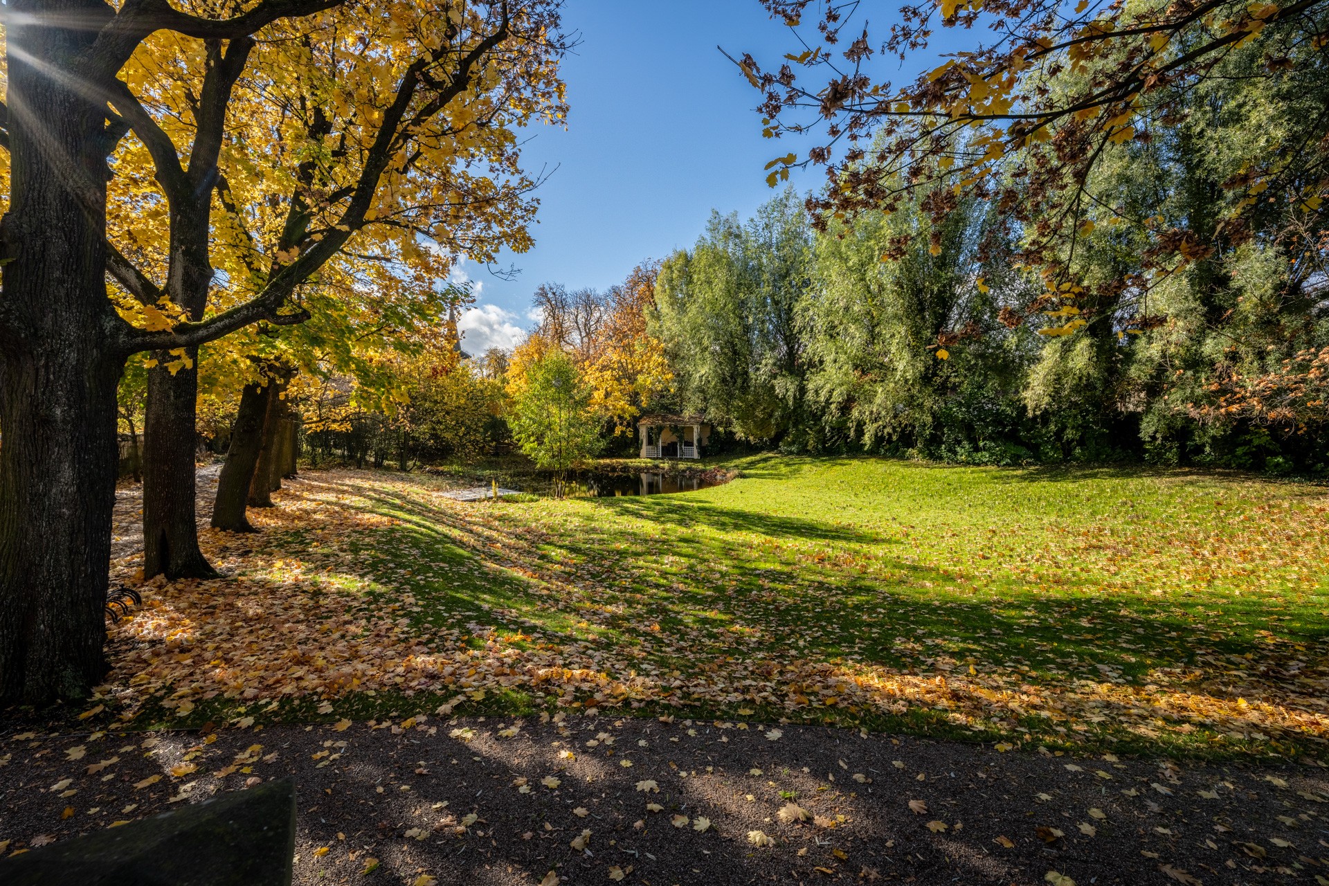 Die Innenräume umfassen einen großzügigen Wohnbereich mit Kamin, der eine warme und zugleich majestätische Atmosphäre schafft. Angrenzend befindet sich eine Terrasse, die nahtlos in den weitläufigen Park übergeht, der mit Teich, Pavillon und Springbrunnen angelegt ist. Der Garten kombiniert einen romantischen englischen Stil mit geometrisch präziser französischer Gartengestaltung und schafft so eine harmonische Verbindung von Natur und Struktur.