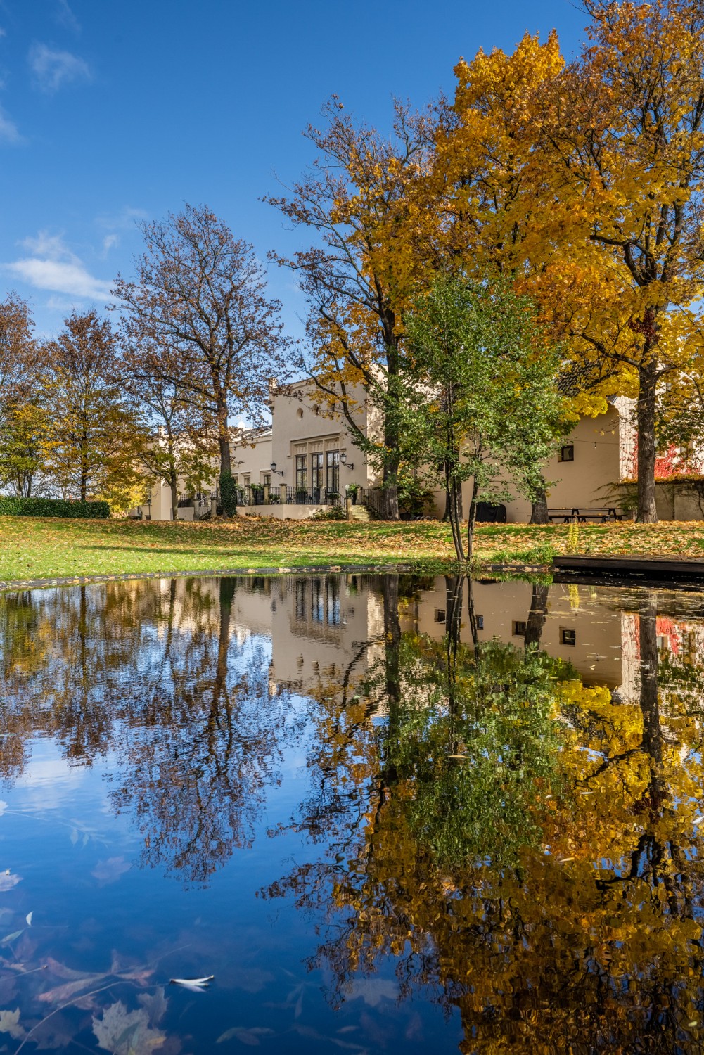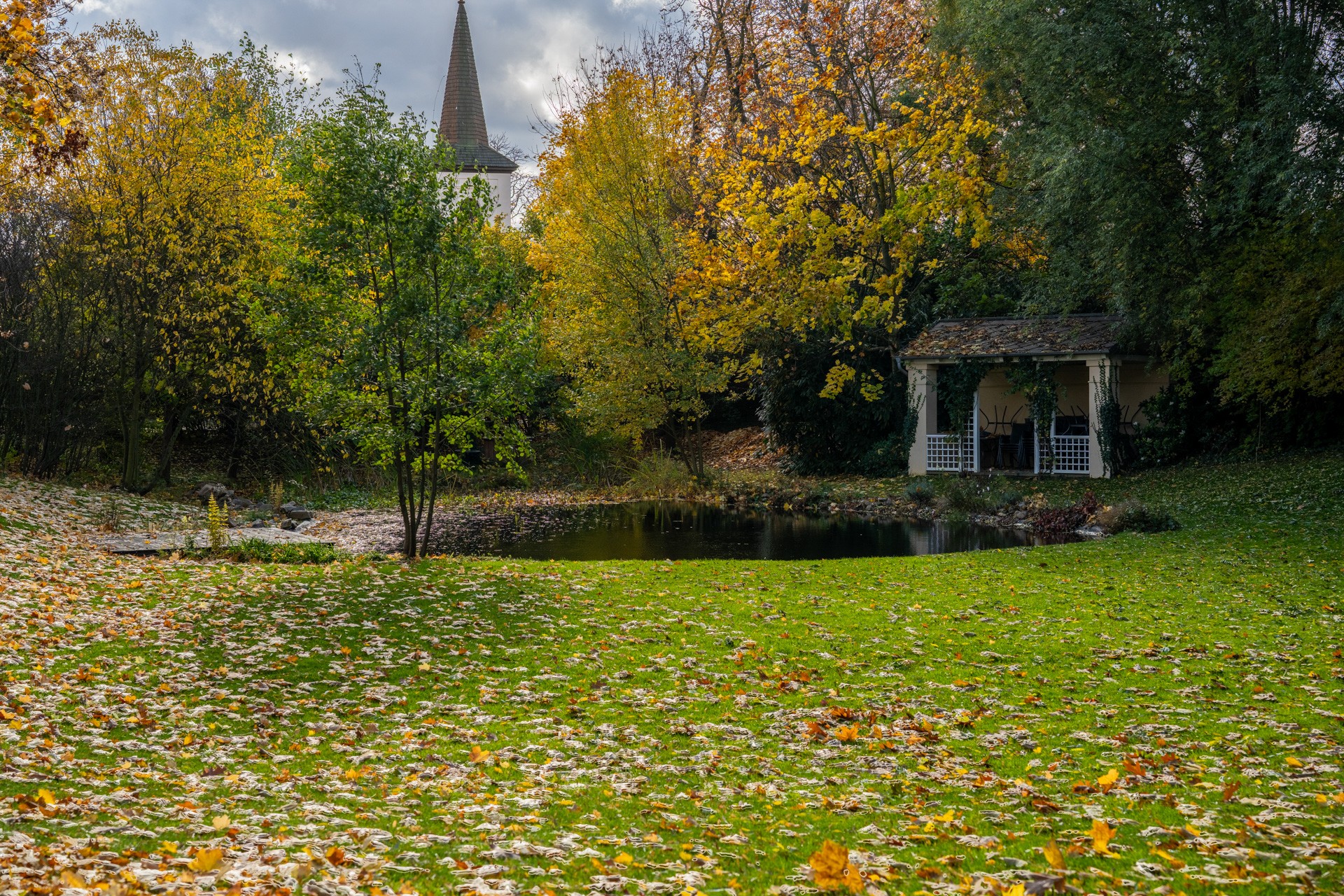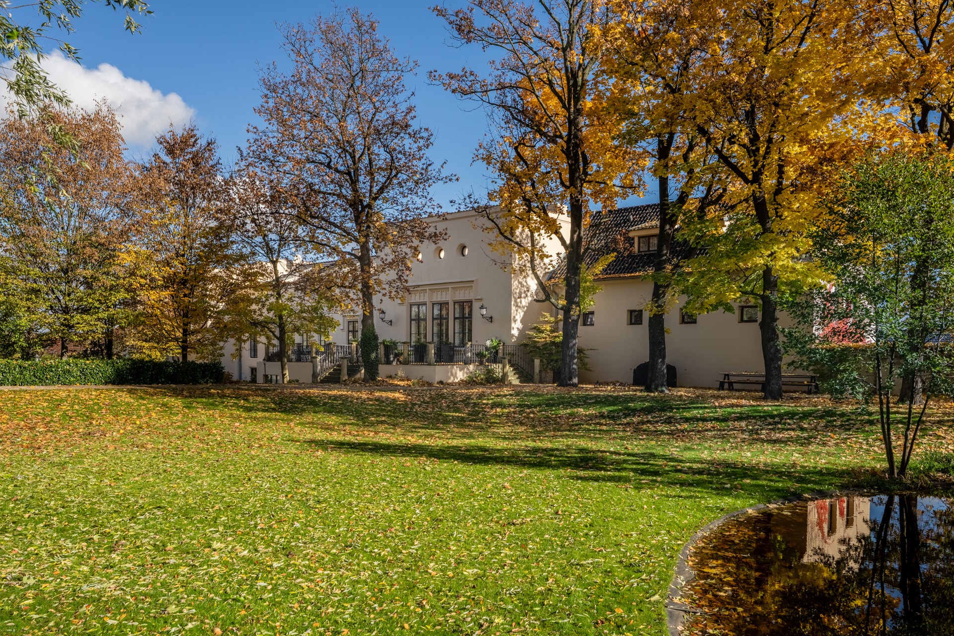 Die Innenräume umfassen einen großzügigen Wohnbereich mit Kamin, der eine warme und zugleich majestätische Atmosphäre schafft. Angrenzend befindet sich eine Terrasse, die nahtlos in den weitläufigen Park übergeht, der mit Teich, Pavillon und Springbrunnen angelegt ist. Der Garten kombiniert einen romantischen englischen Stil mit geometrisch präziser französischer Gartengestaltung und schafft so eine harmonische Verbindung von Natur und Struktur.