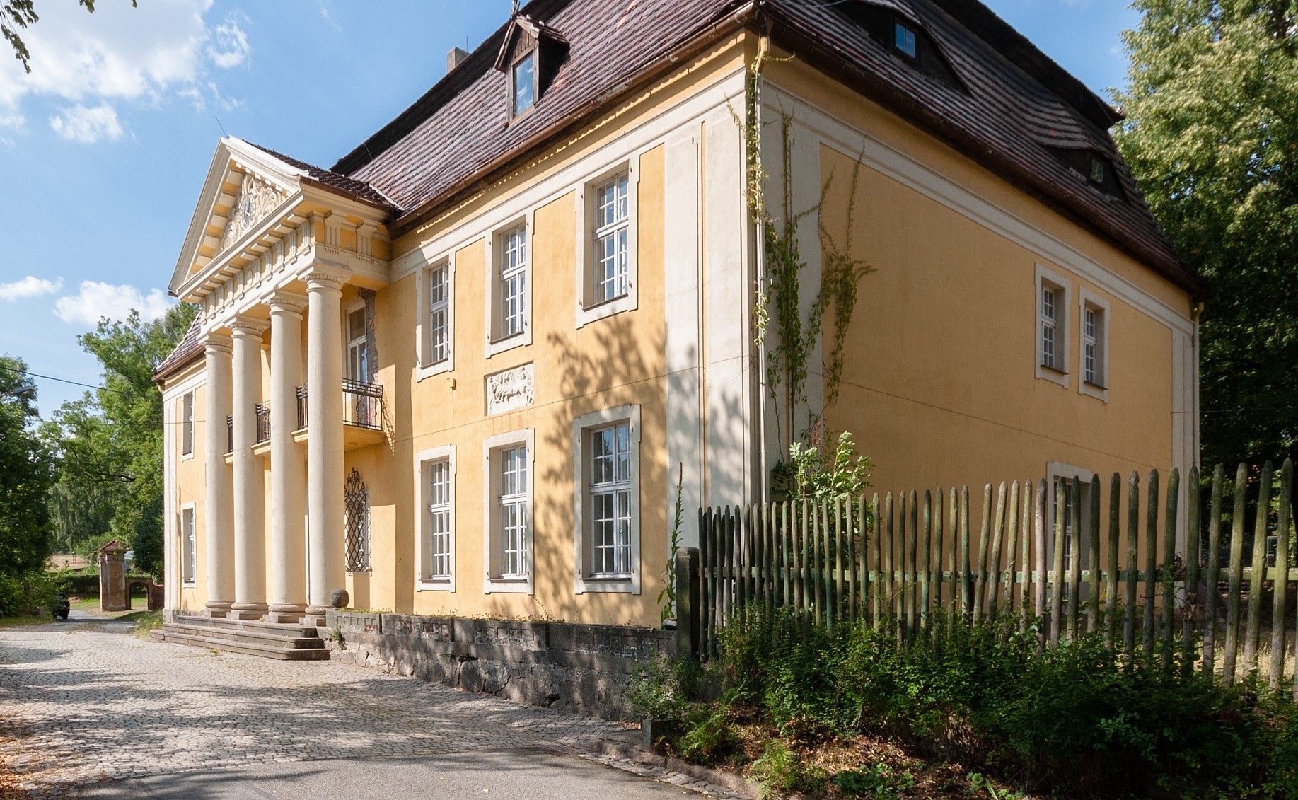 Das massive Barockschloss wurde um 1724 auf einem geschichtsträchtigen Areal errichtet, dessen Nutzung als Rittergut bis in das 13. Jahrhundert zurückreicht. Ein im Fels gehauener Keller mit altem Brunnen und Gangsystemen belegt die frühe Besiedlung. Die Architektur wird durch 90 cm starke Außenmauern und ein original erhaltenes Mansardendach geprägt, das zu den frühesten Beispielen dieser Bauform in der Oberlausitz zählt. Ein Säulenportikus mit integrierter Turmuhr (Werk von Georg Richter, Berlin um 1920) bildet das Zentrum der Süd-West-Fassade. Die Uhr verfügt über einen Viertelstundenschlag und wird wöchentlich gewartet.