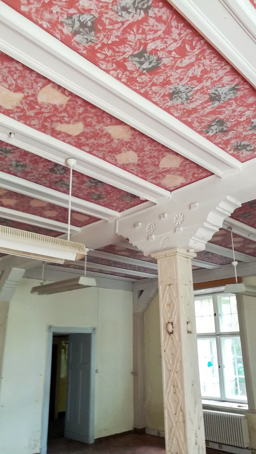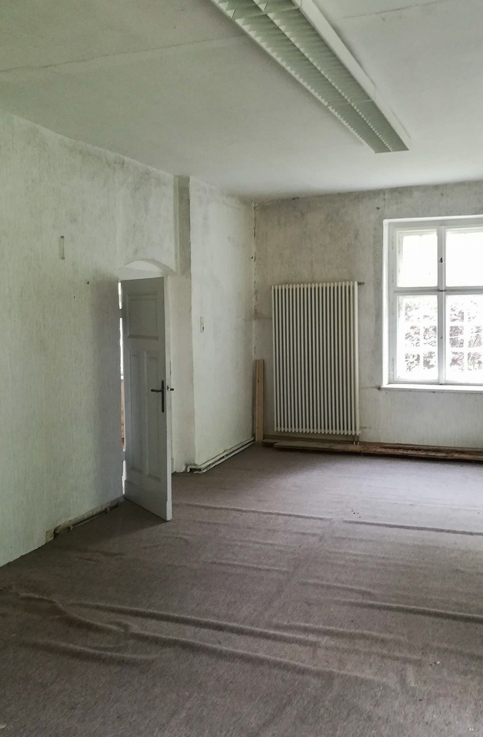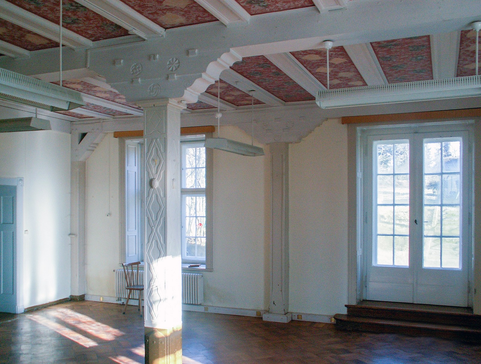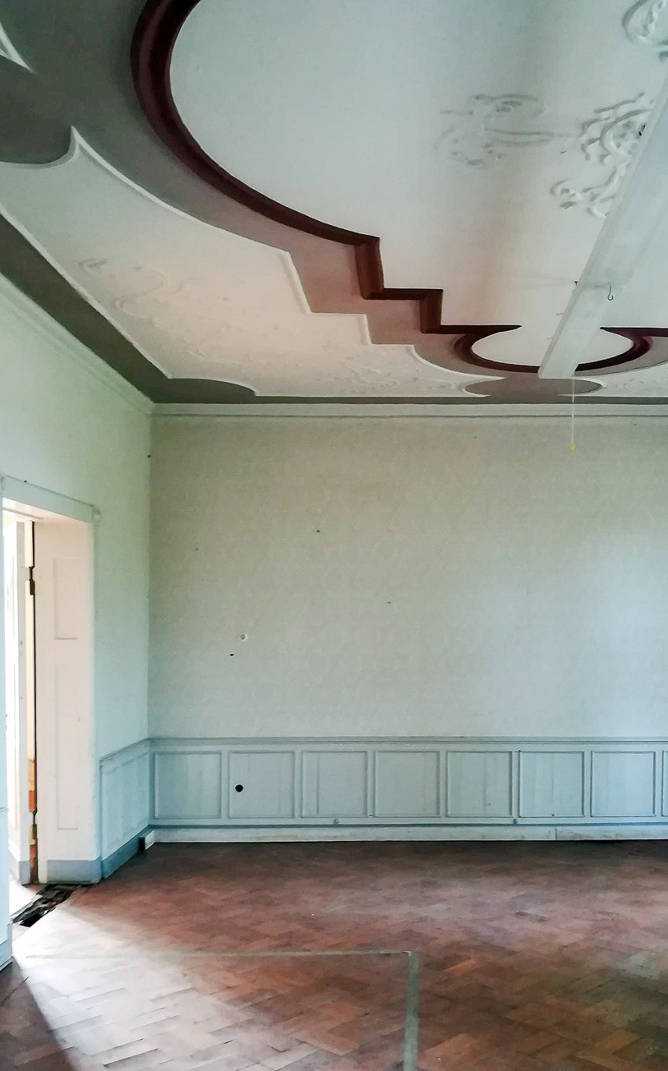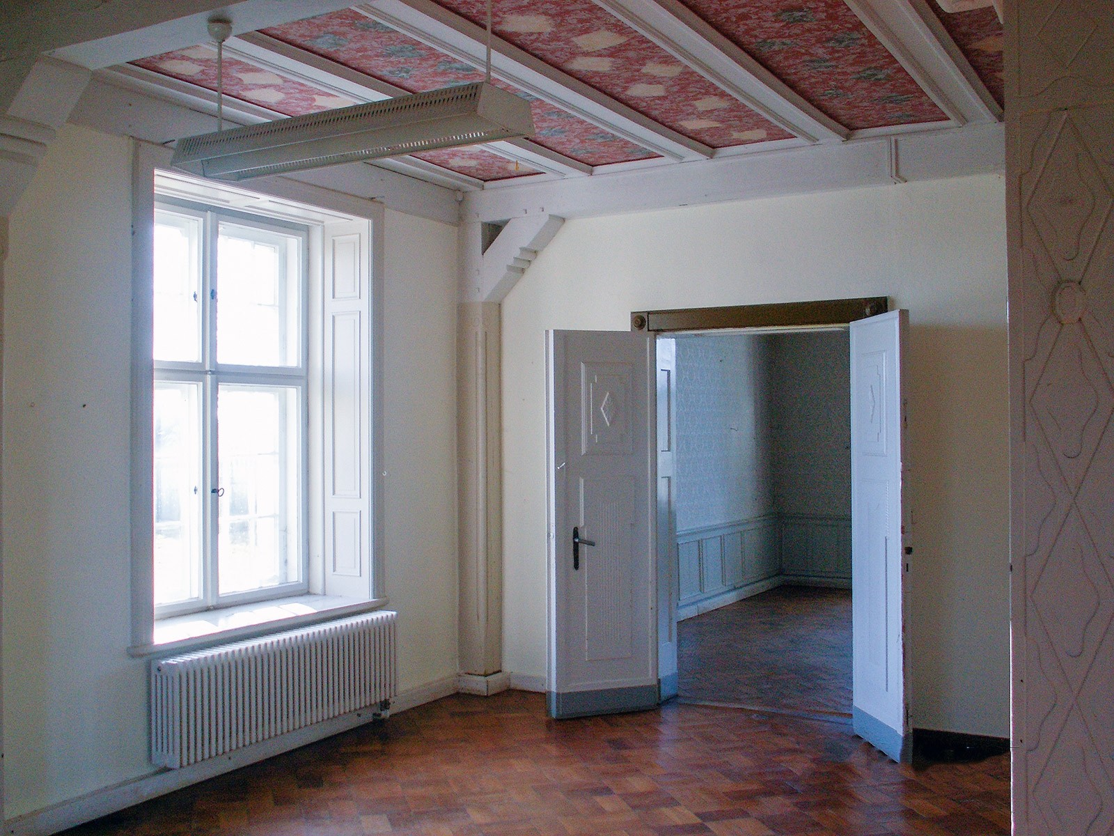 Während im Erdgeschoß ein Salon mit barocker Stuckdecke hervorzuheben ist, weisen die Räume im Obergeschoß gut erhaltene historische Dielenböden auf. Diese waren über Jahrzehnte durch Beläge geschützt. Im Gegensatz dazu erfordert das Erdgeschoß eine grundlegende Erneuerung der Fußböden (aktuell Estrich, Fliesen oder schadhaftes Parkett).