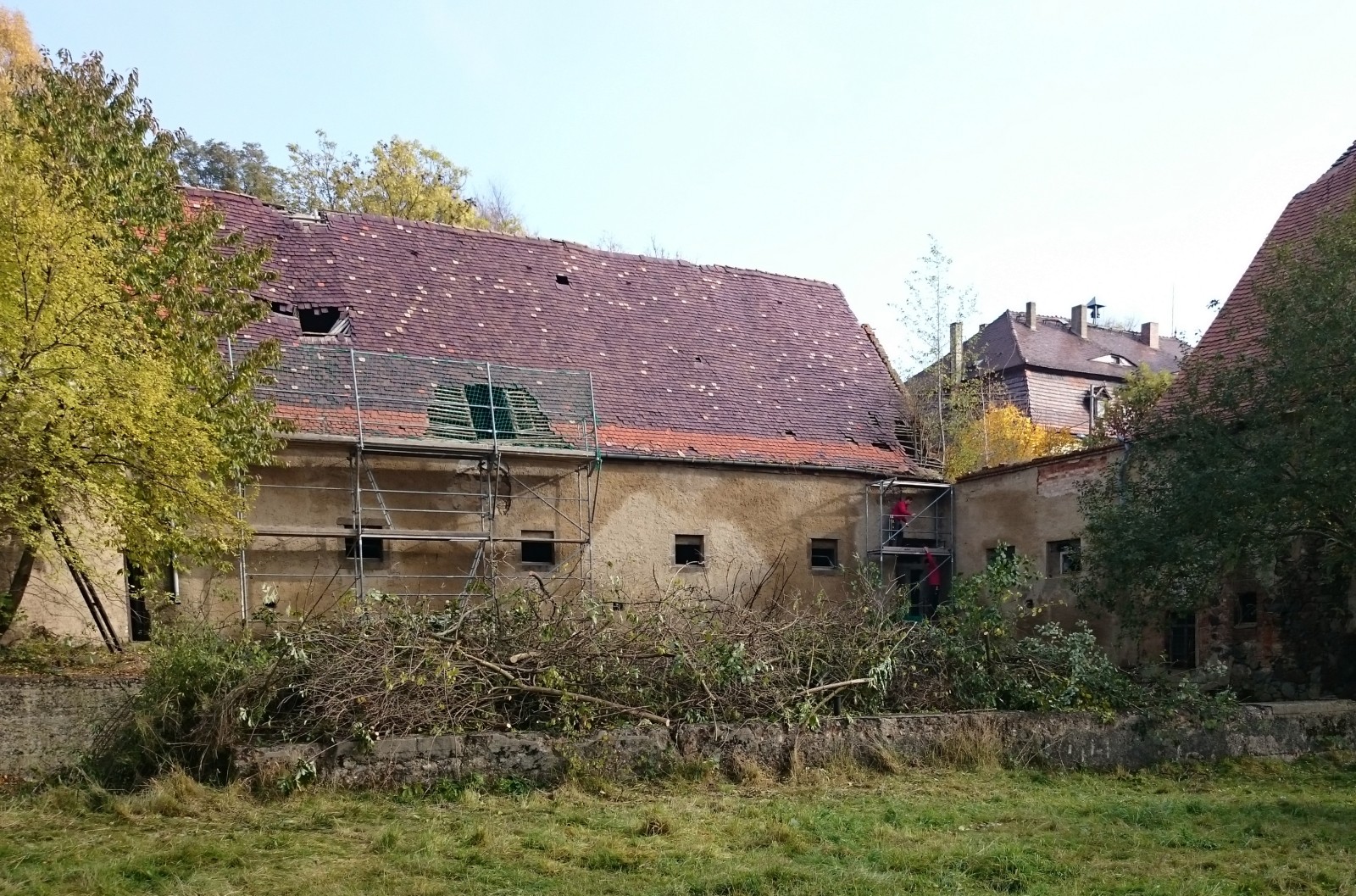 Ein separates Nebengebäude (ehemalige Stallungen, ca. 230 m²) bietet zusätzliche Nutzfläche. Es zeichnet sich durch eine Gewölbedecke auf Granitsäulen und einen großzügigen Speicher aus. An diesem Gebäude wurden bereits statische Sicherungsmaßnahmen am Dach sowie Instandsetzungen am Gebälk und der Dielung durchgeführt.
