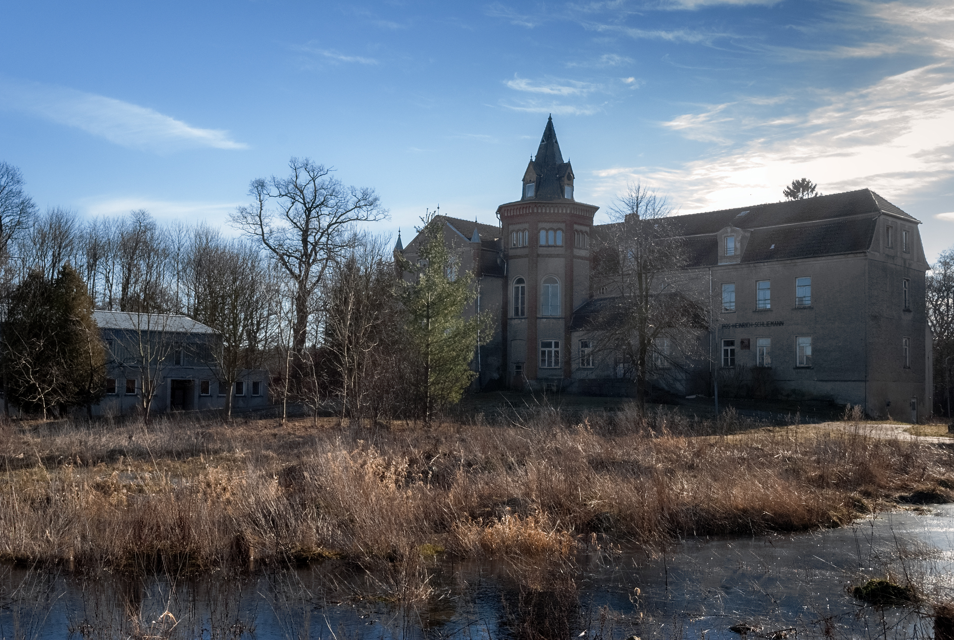 Neogotisches Gutshaus in sozialistischem Gewand. Dennoch haben sich im Inneren bauzeitliche Elemente erhalten, darunter die Wendeltreppe im Turmanbau sowie schöne Spitzbogendecken. Der rückseitige Schulanbau wurde in jüngster Zeit abgerissen.