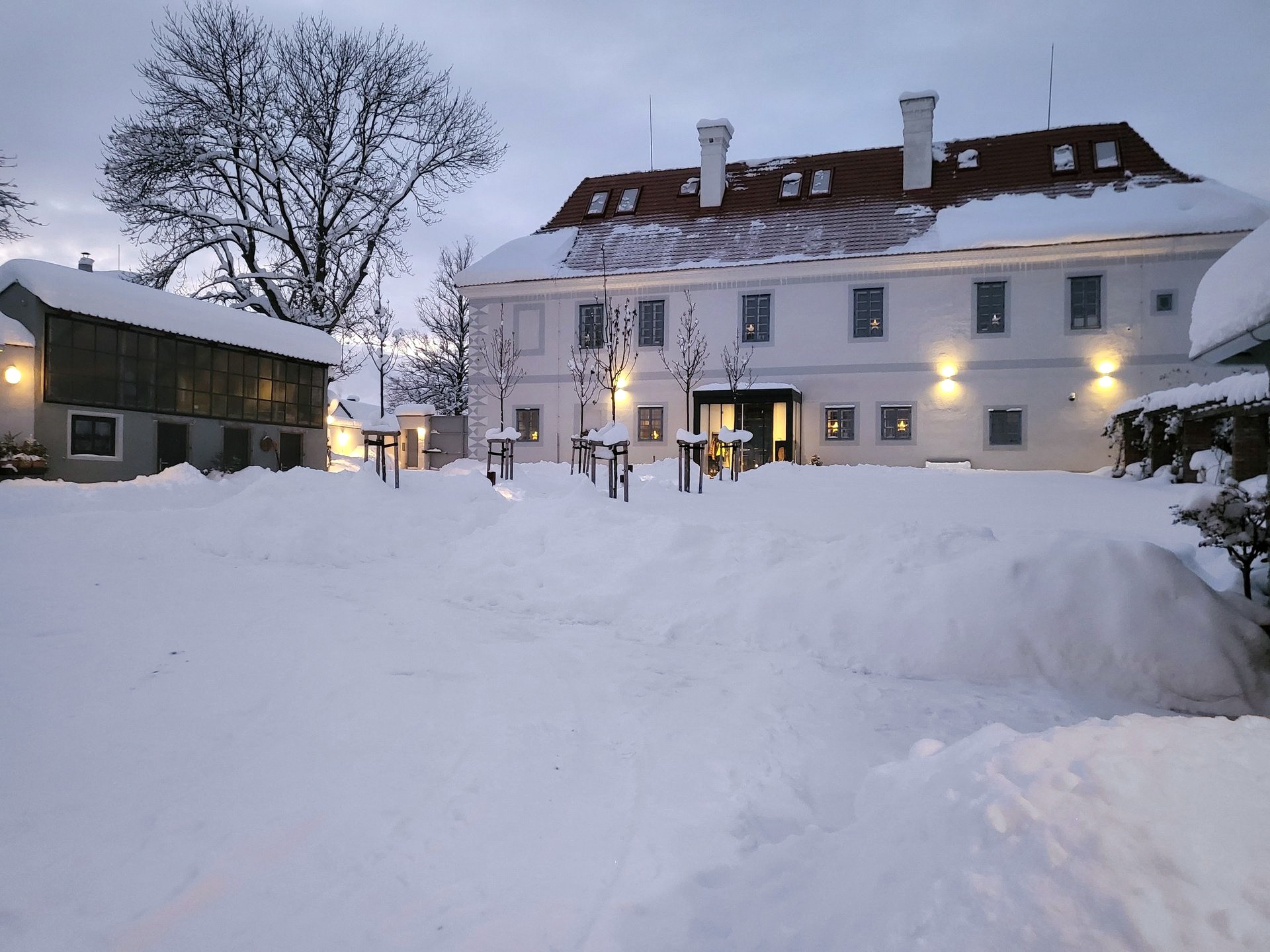 Innergården, som en motvikt till slottsbyggnaden, avslutas i slutet av axeln för den förbindande trädraden genom det stora byggnaden av slottsladan med en glasdörr. Den fungerar som en öppen plats för ägarnas avkoppling och underhållning (privata fester, vernissager, presentationer, konserter). Det finns en stor, professionellt utrustad bar med en bardisk, en pizzaugn och en elektrisk grill. Rummet är utrustat med en egen scen med komplett ljudsystem, belysning och videoprojektion med storskärm. Den totala kapaciteten är upp till 60 sittplatser (215 m²).